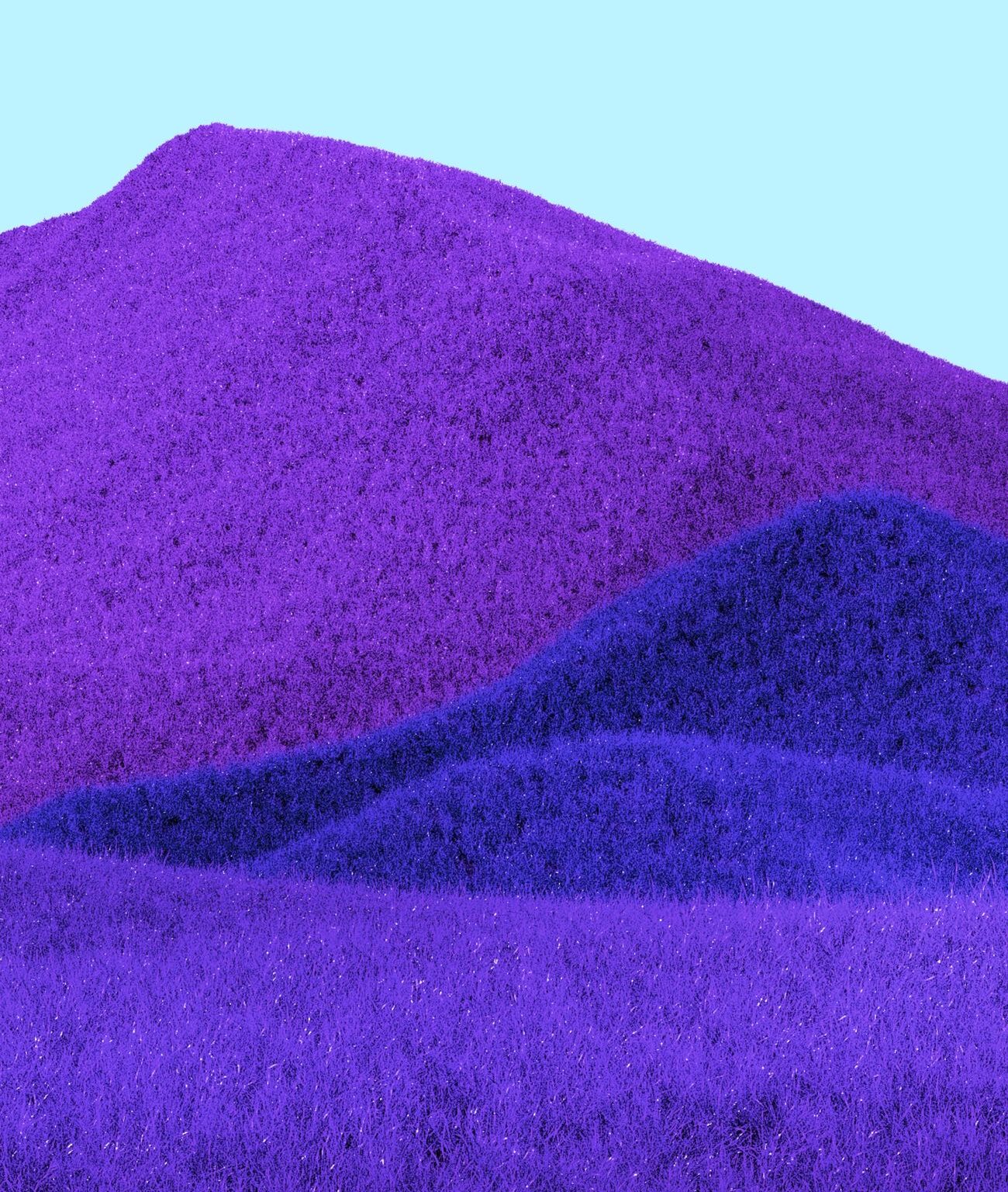 Rolling hills in shades of purple fill the frame, appearing to be reflected in dark water below. The close-up composition emphasizes the tex