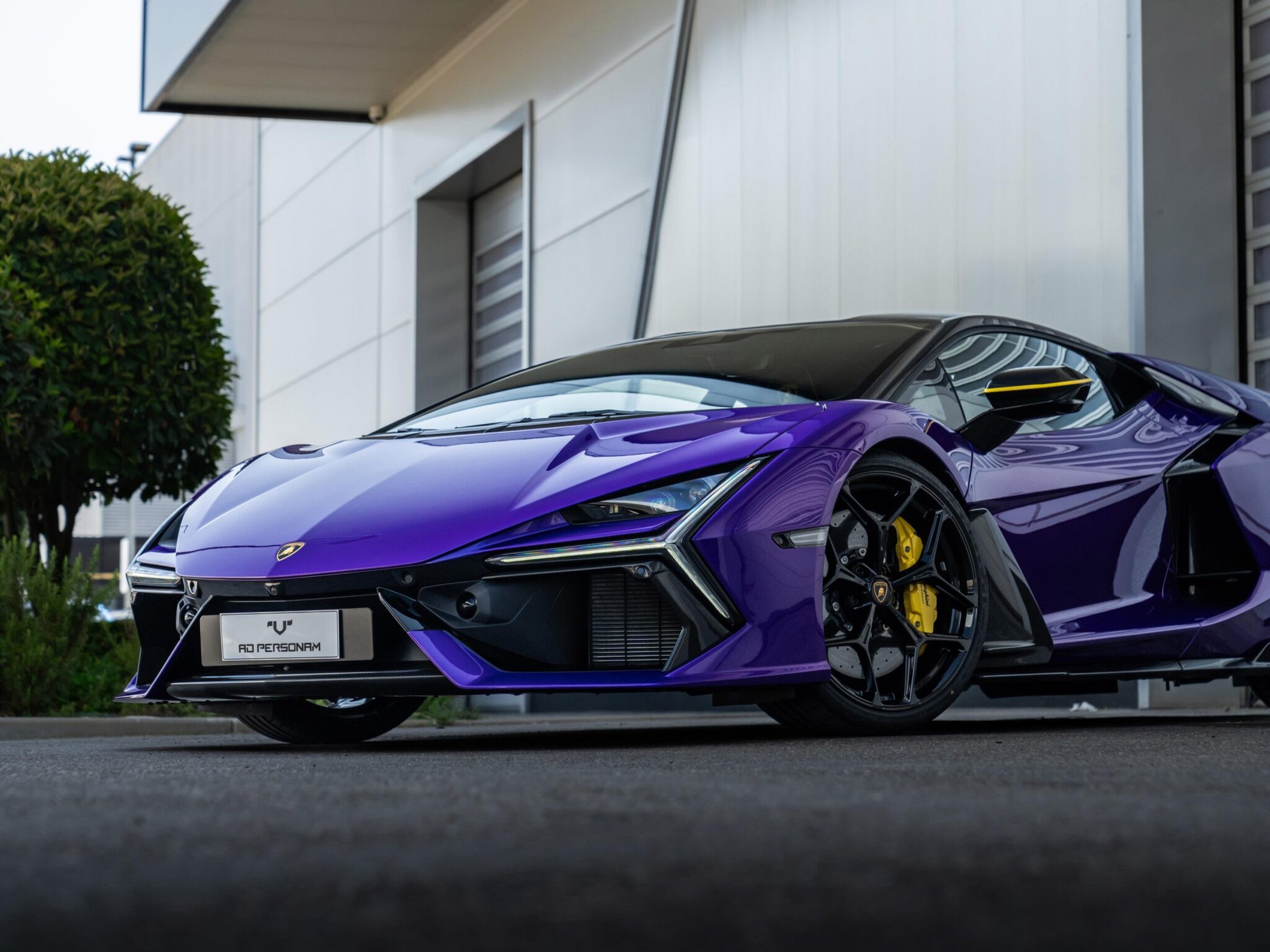 A purple Lamborghini Aventador is parked on asphalt in front of a modern building. Yellow brake calipers provide a strong color contrast aga…