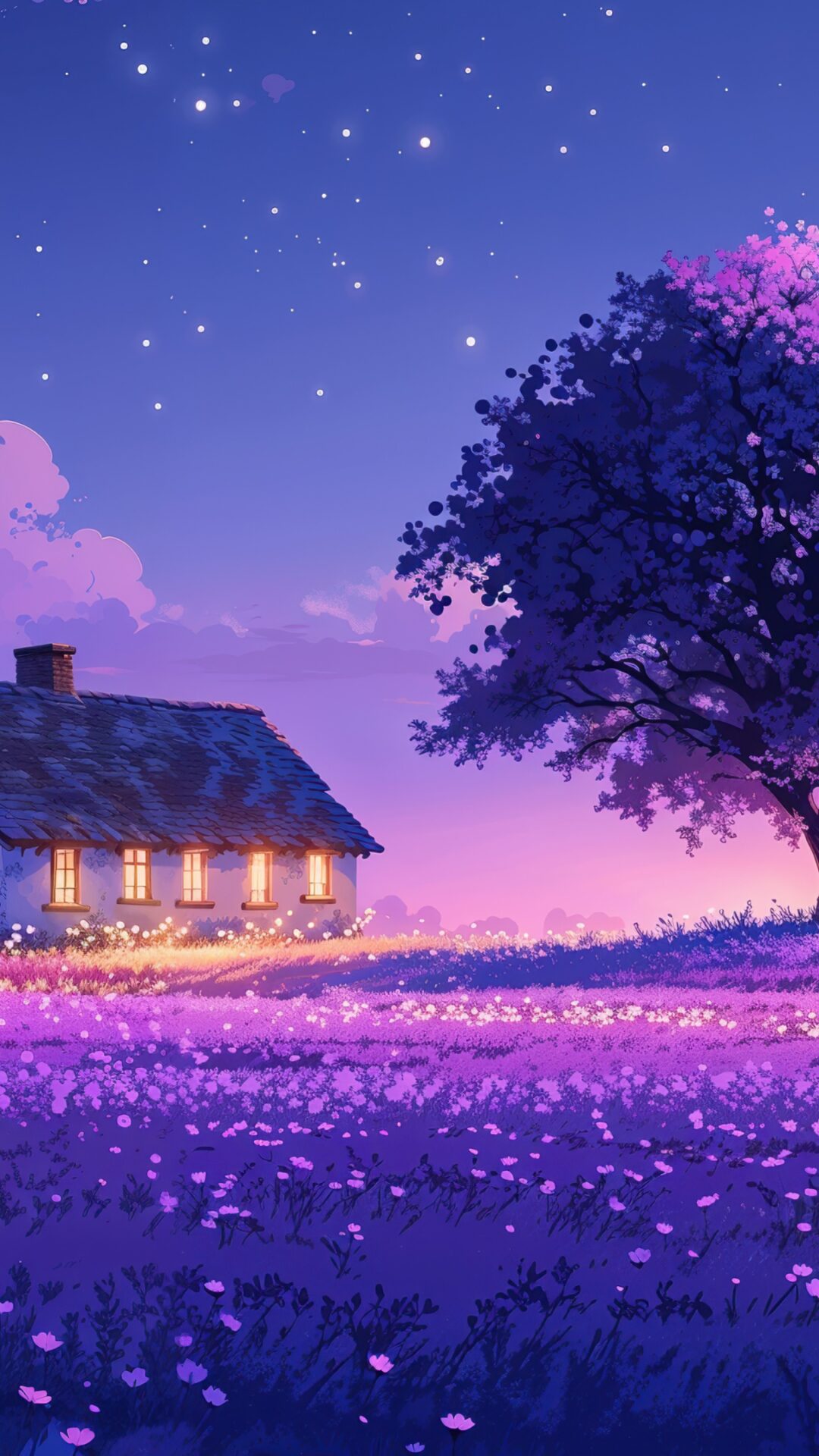Purple and pink hues paint this dreamy countryside scene with a cozy cottage, blooming tree, and field of violet flowers under a starlit sky