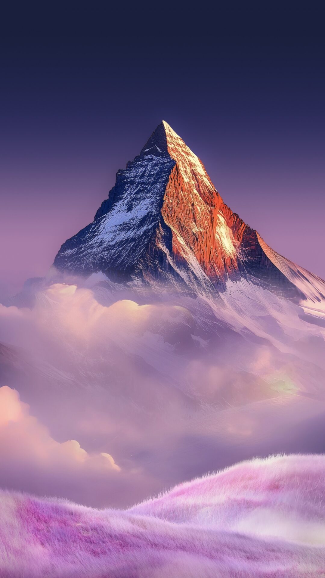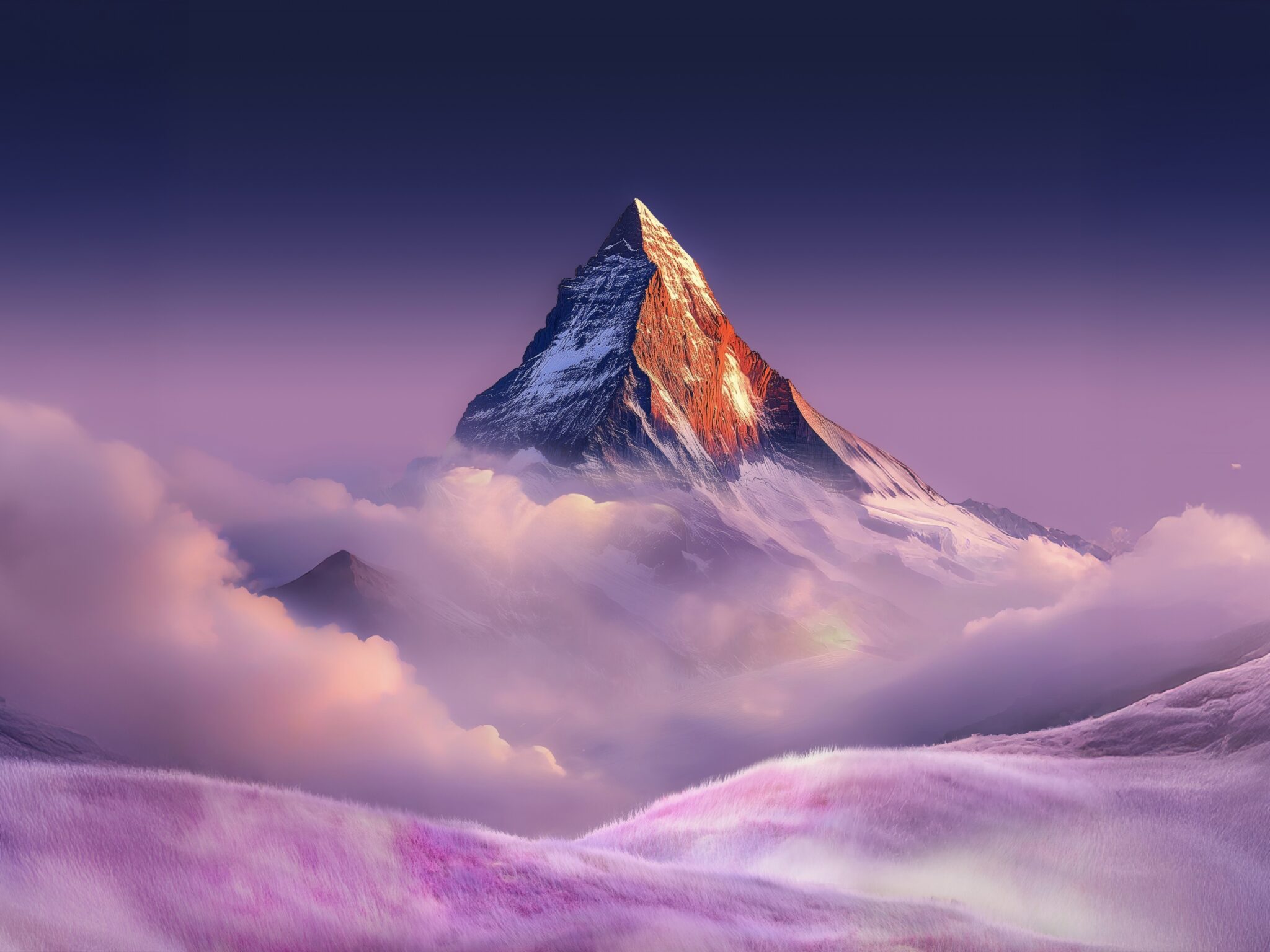 Majestic snow-capped peak rises through soft lavender and pink clouds with warm orange light catching the rocky summit against a deep violet