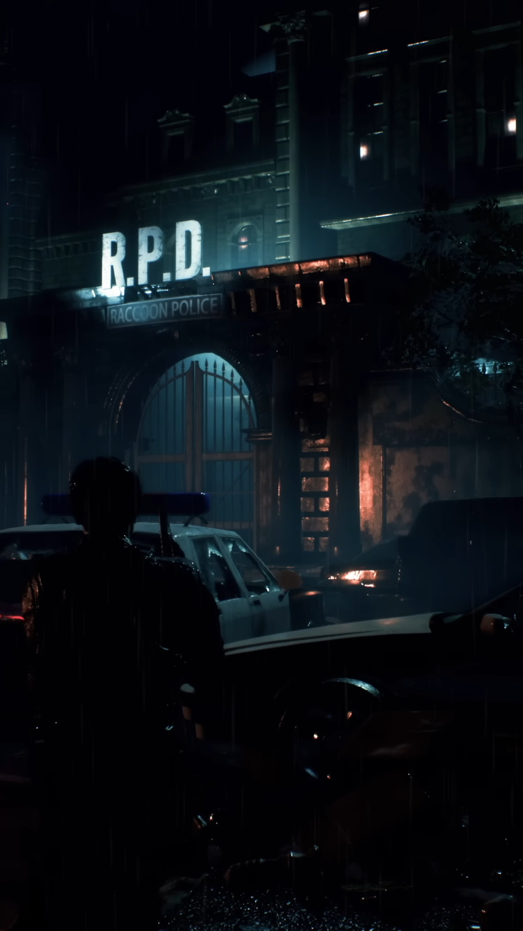 A large building with 'R.P.D.' illuminated on its facade is framed by a street lined with parked cars. The cool, dark blue tones create a st
