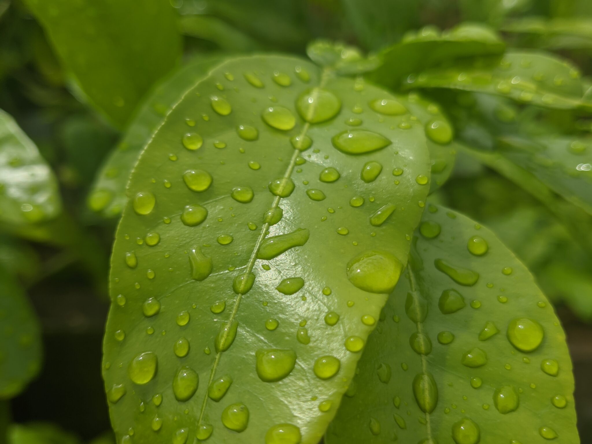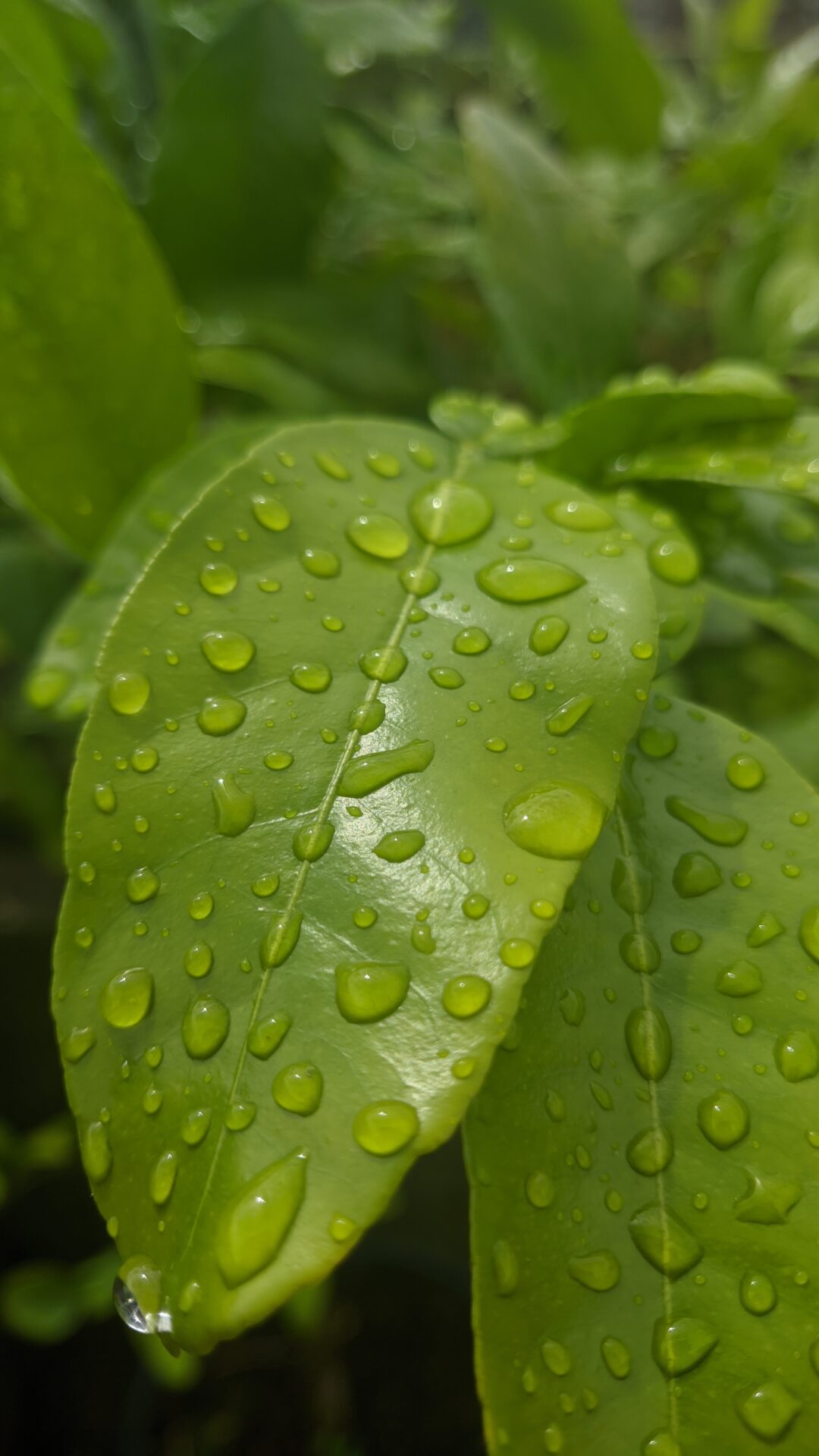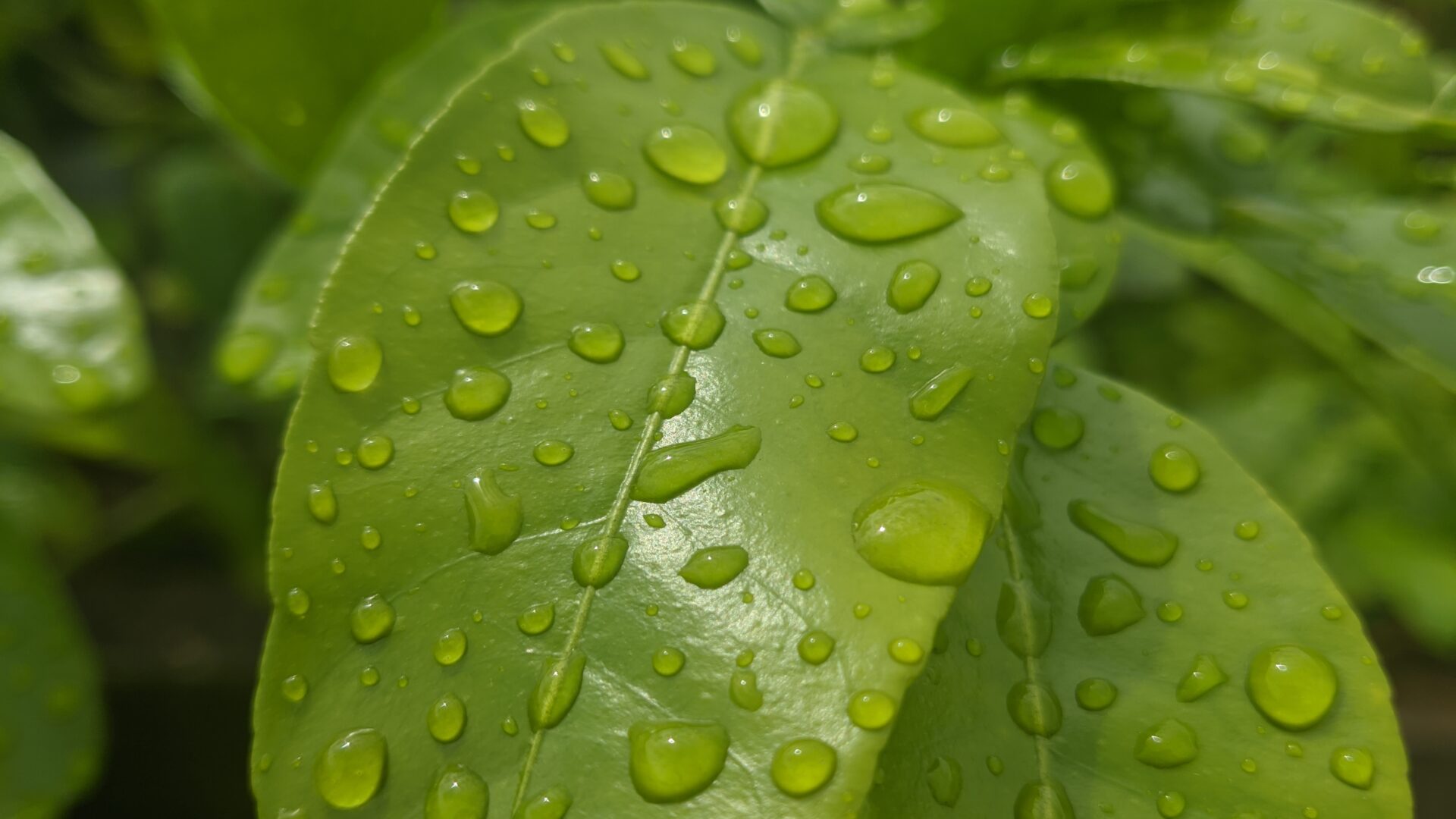 Macro lens pressed close to vivid green foliage, every leaf surface beaded with water drops catching the light. The color is deep and satura