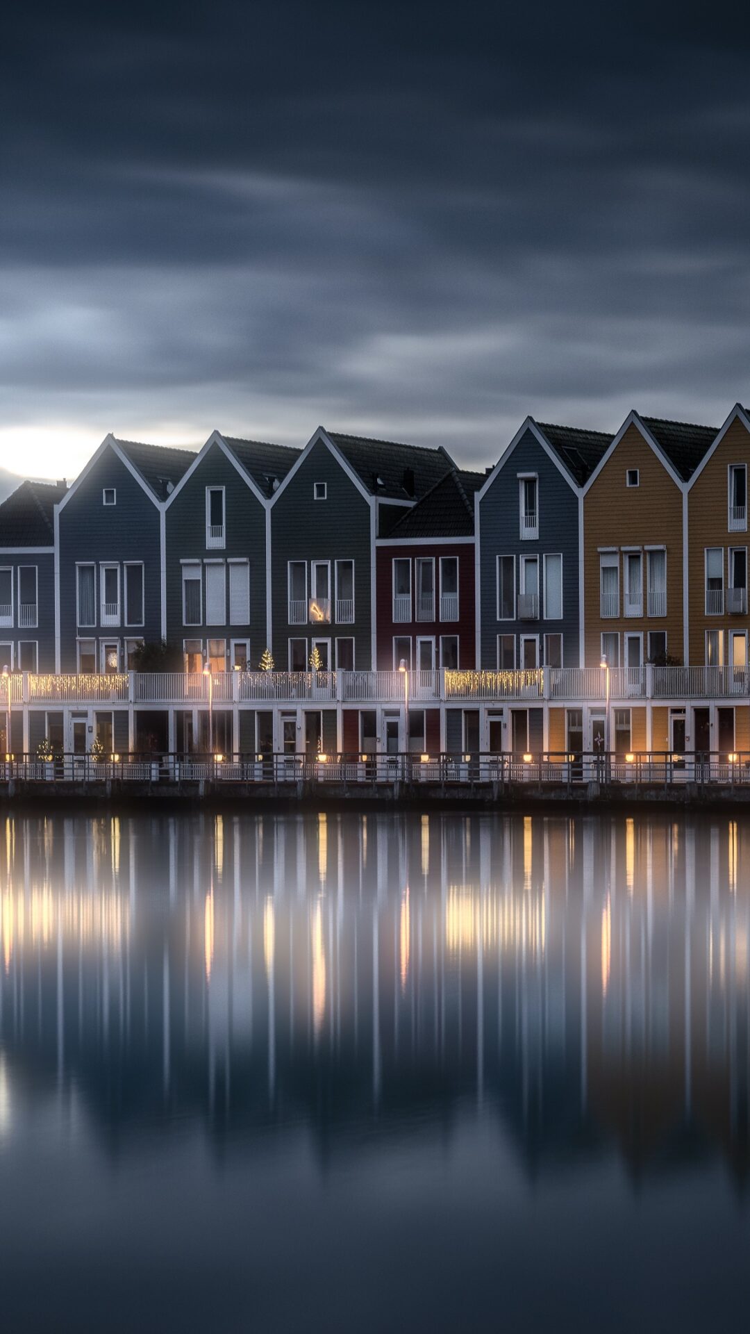 Row of colorful Dutch houses in rust orange, slate blue, forest green and deep red sitting along calm water with warm lights reflecting below a moody grey sky. For 4K monitors.