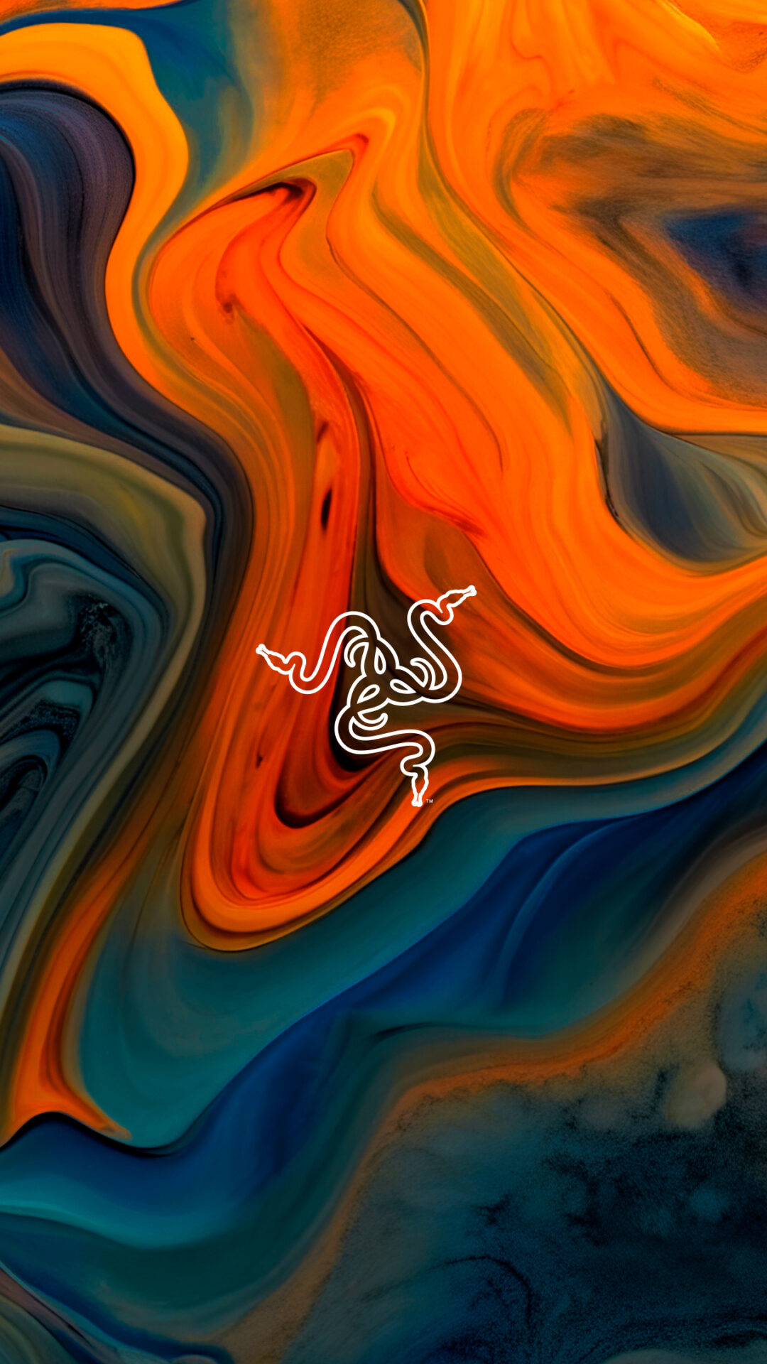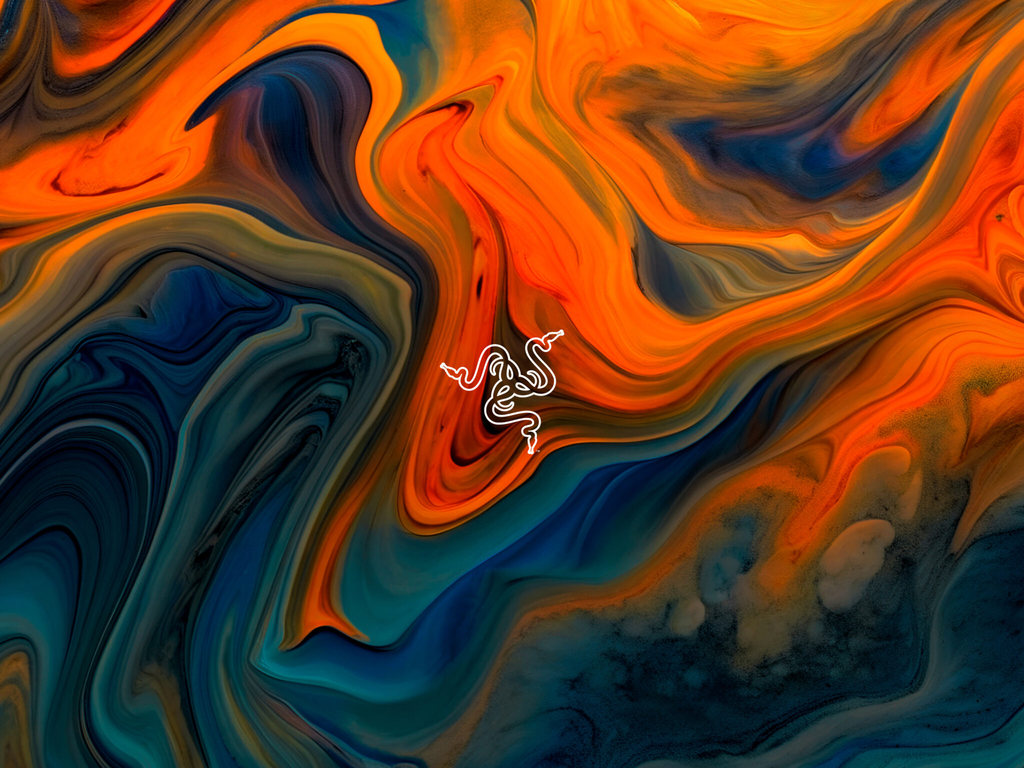 Swirling marble-like patterns in burnt orange, deep teal, and black flow around the Razer triple snake logo in the center. For 4K monitors,
