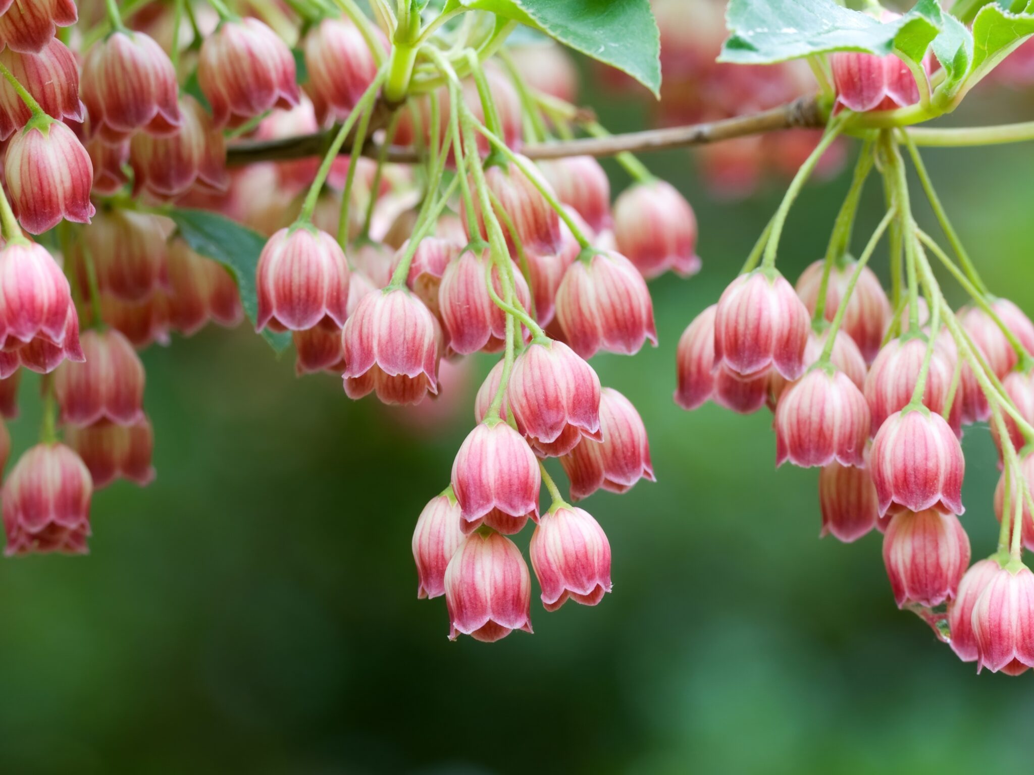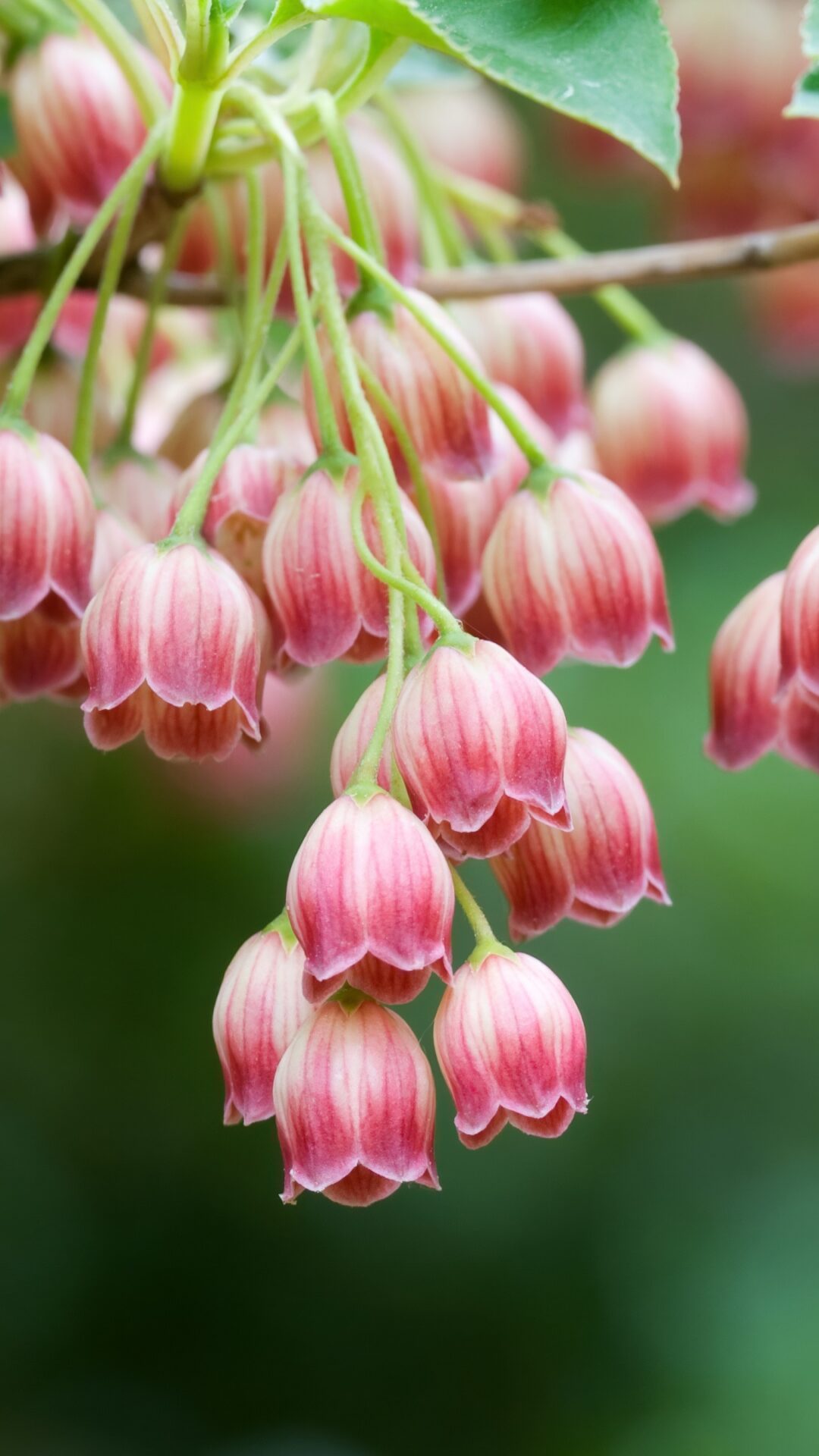Delicate pink and coral bell-shaped flowers hang in graceful clusters against a soft green background, with subtle cream striping on each ti…