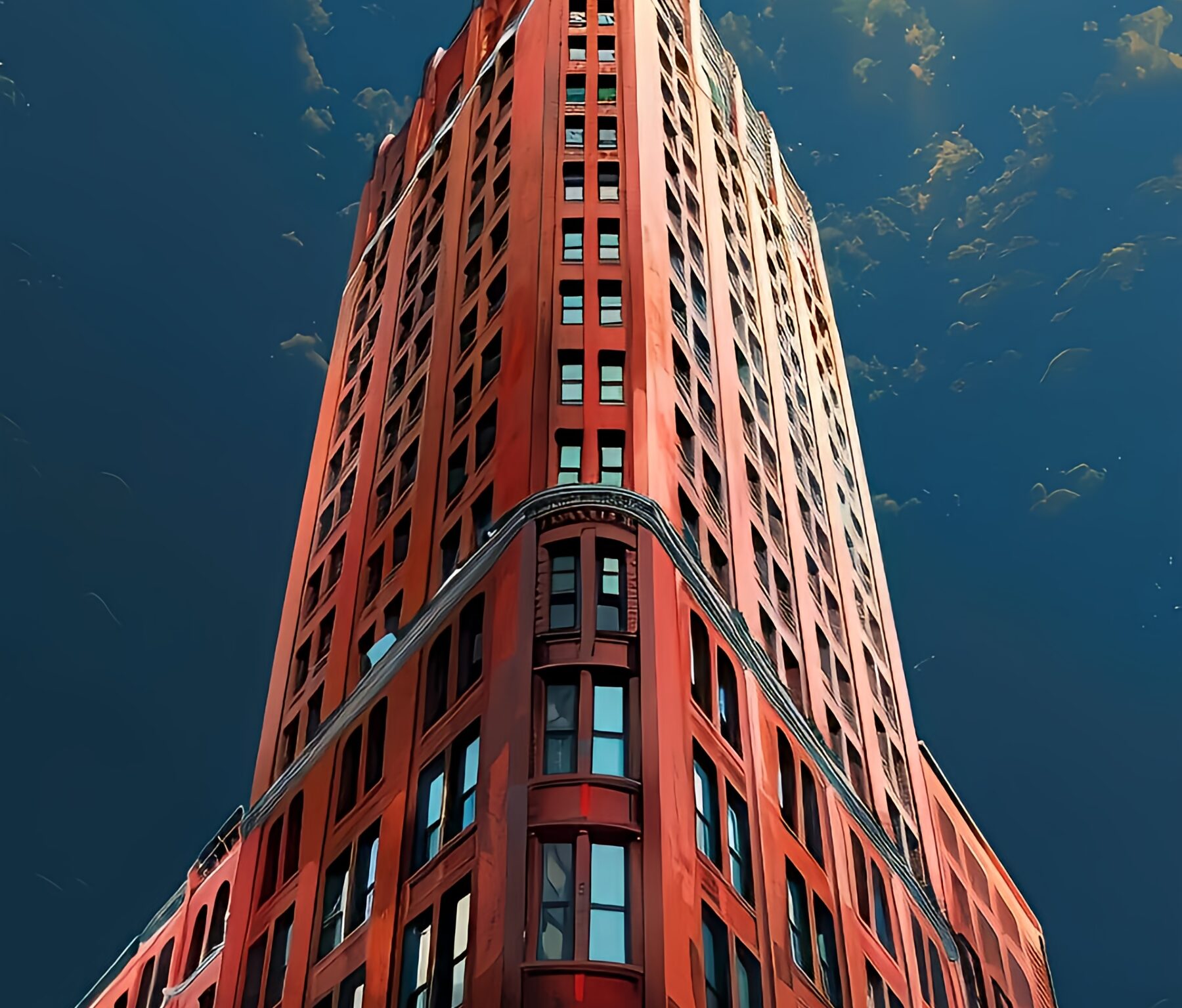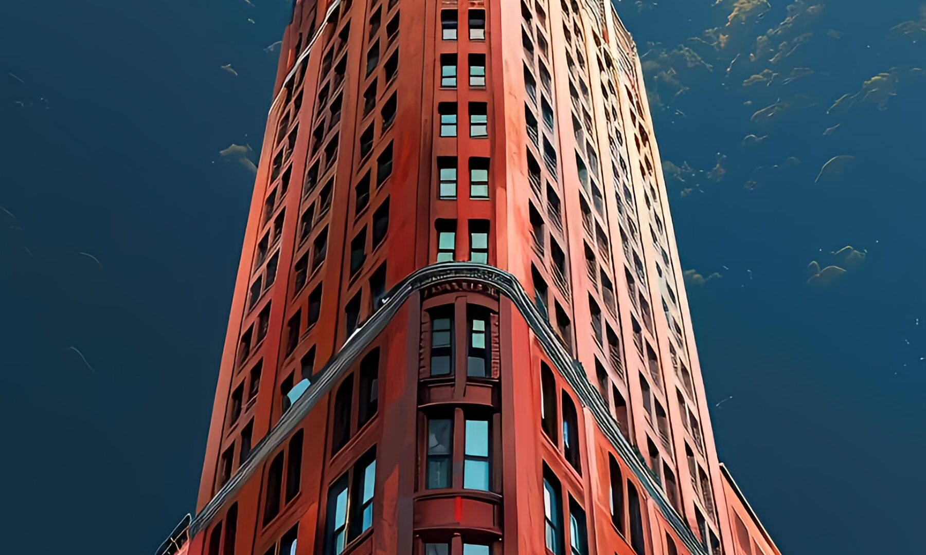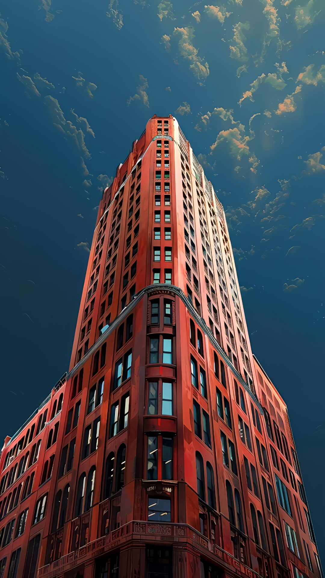A tall building with many windows is photographed from a low angle against a dark blue sky. The red brick facade catches warm light, creatin…