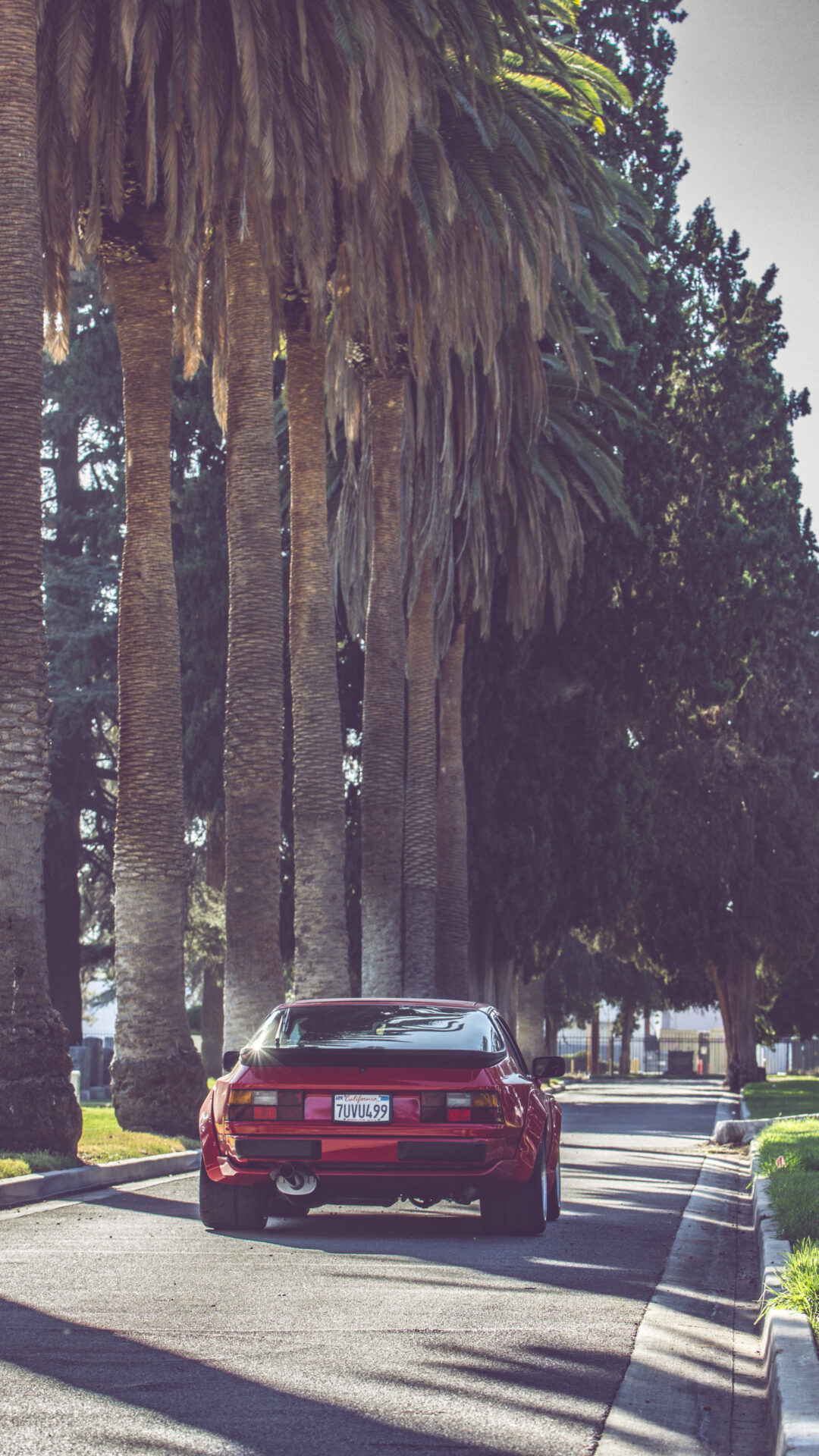 A red coupe drives down a road framed by tall palm trees and evergreen shrubs. Sunlight casts long shadows across the asphalt and green lawns, creating a sense of depth.