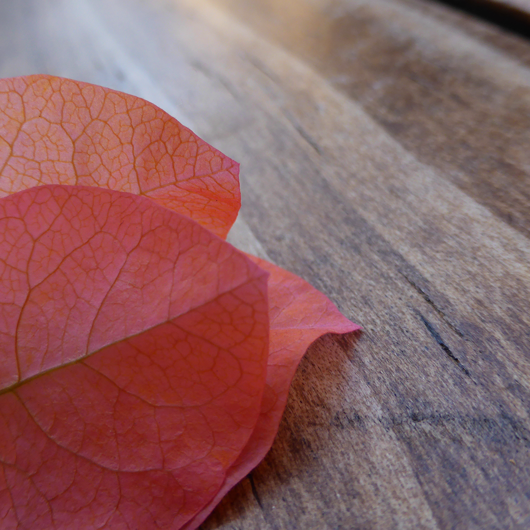 Two red leaves rest on a weathered wooden surface, angled towards the viewer. Sunlight illuminates the intricate vein patterns within the translucent leaves and highlights the warm tones of the wood.