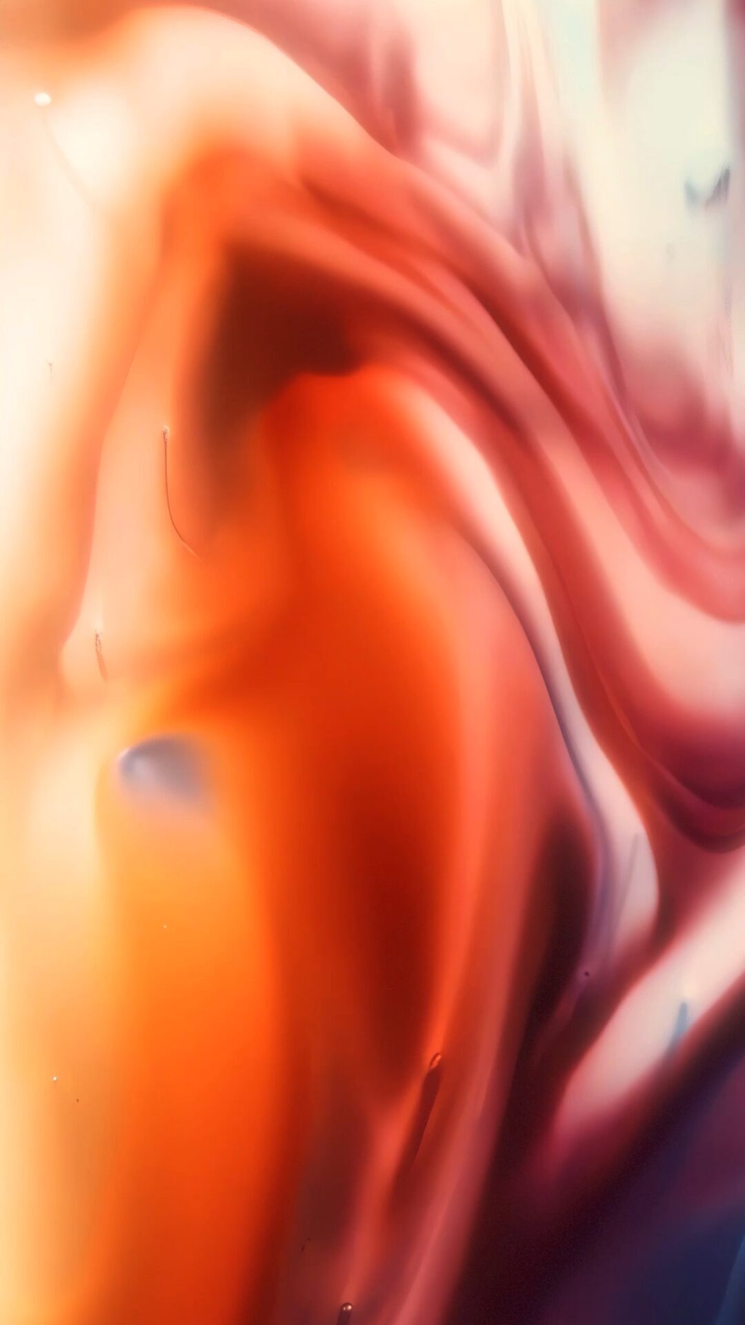 Red and orange paint swirls flow across the frame in a close-up composition. Soft gradations of color and blended textures create a sense of depth.