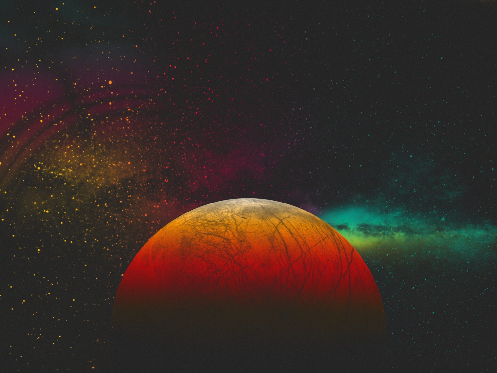 This vibrant space scene shows a glowing red and orange planet with intricate surface lines floating against a colorful cosmic backdrop of p