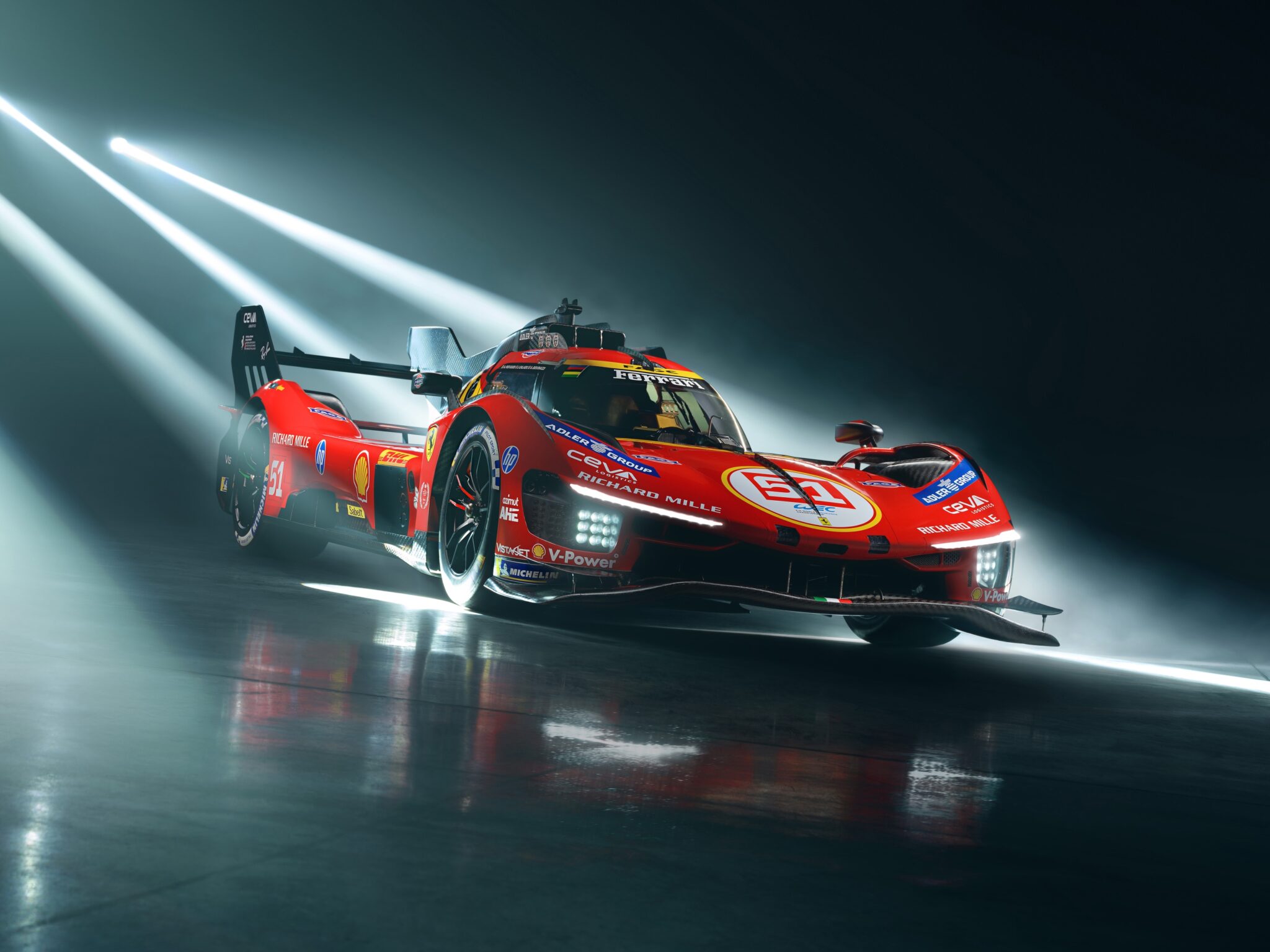 A red and black prototype race car is positioned at a slight angle in a dark studio setting. Strong beams of white light create dramatic highlights across the vehicle’s surface and a shallow depth of field.