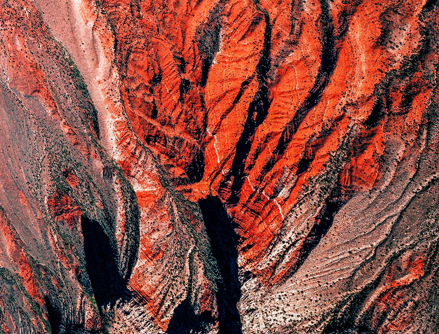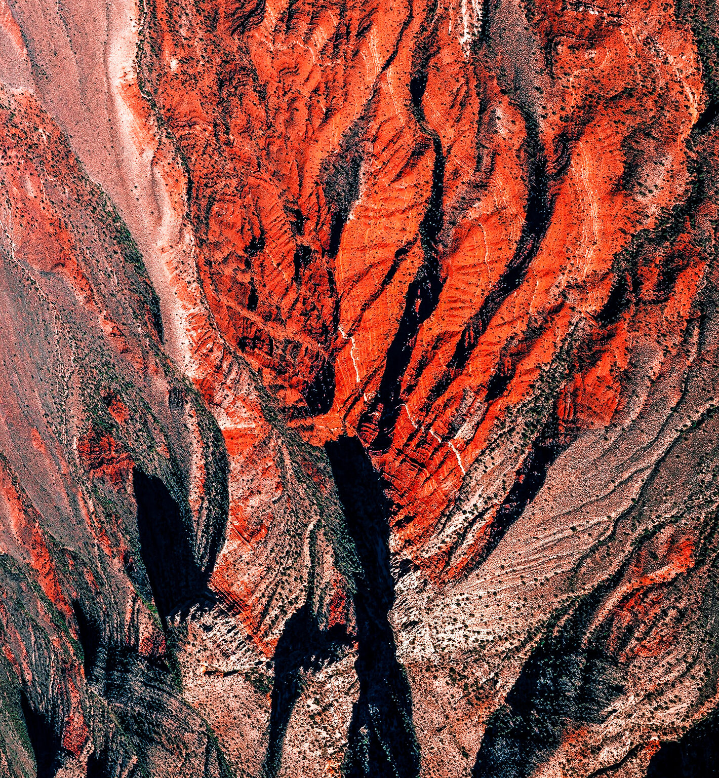 An aerial view reveals a winding river delta cutting through a reddish-brown, textured landscape. Deep shadows and the high angle emphasize