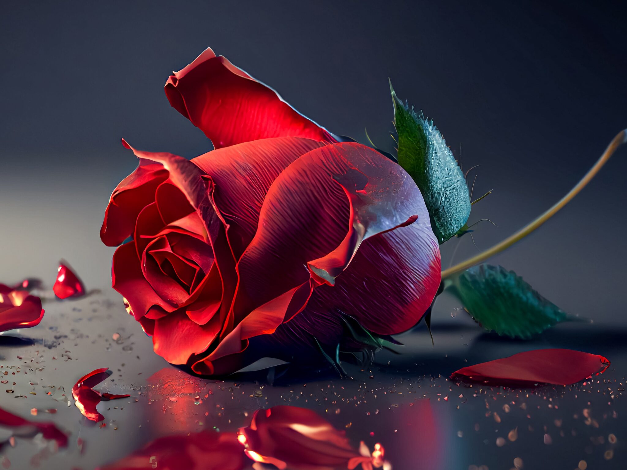 A single red rose rests on a dark surface, surrounded by loose petals. Water droplets cling to the petals and surface, creating subtle highl