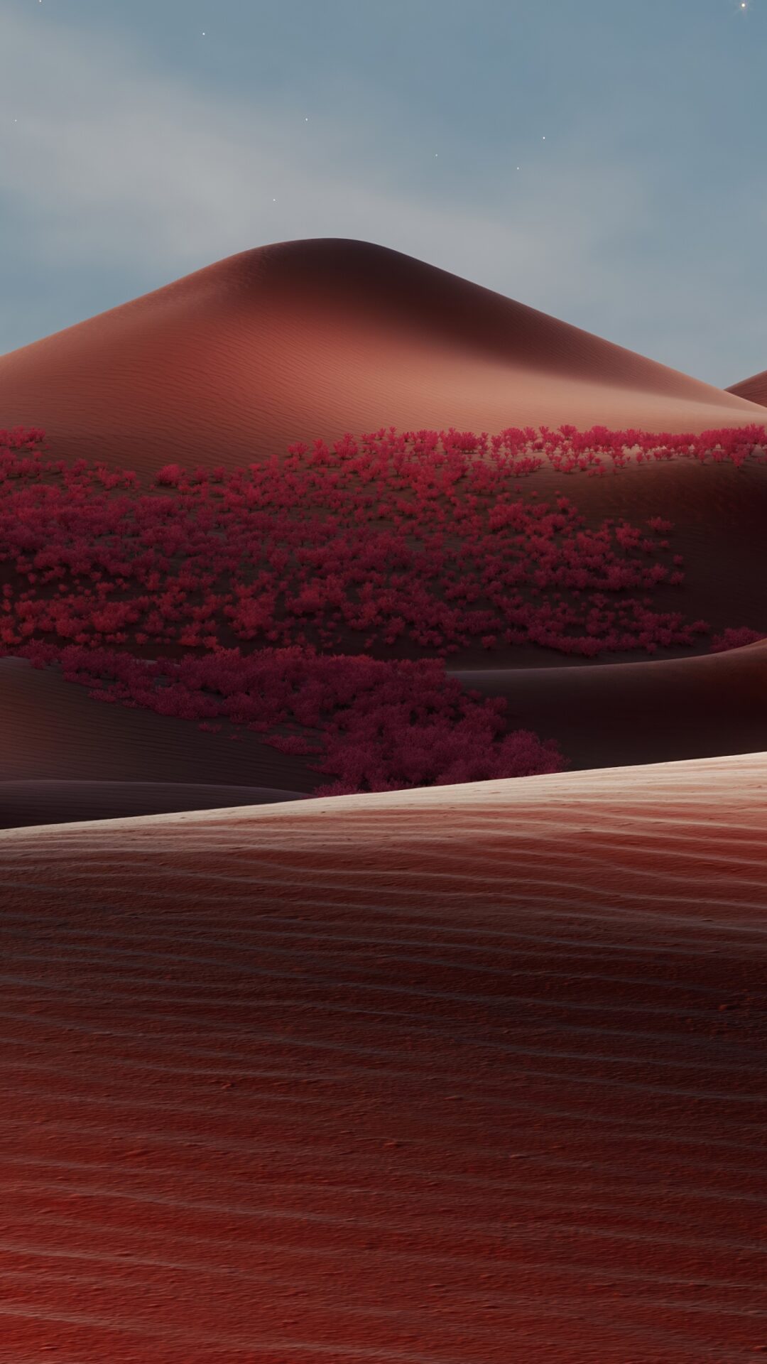Rolling red sand dunes fill the foreground with a patch of dark red vegetation nestled in a valley. A pale blue sky and distant stars create depth above the curved, textured landscape.