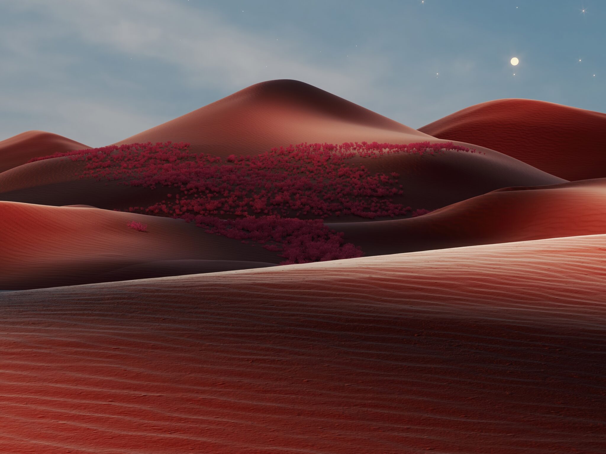 Rolling red sand dunes fill the foreground with a patch of dark red vegetation nestled in a valley. A pale blue sky and distant stars create…