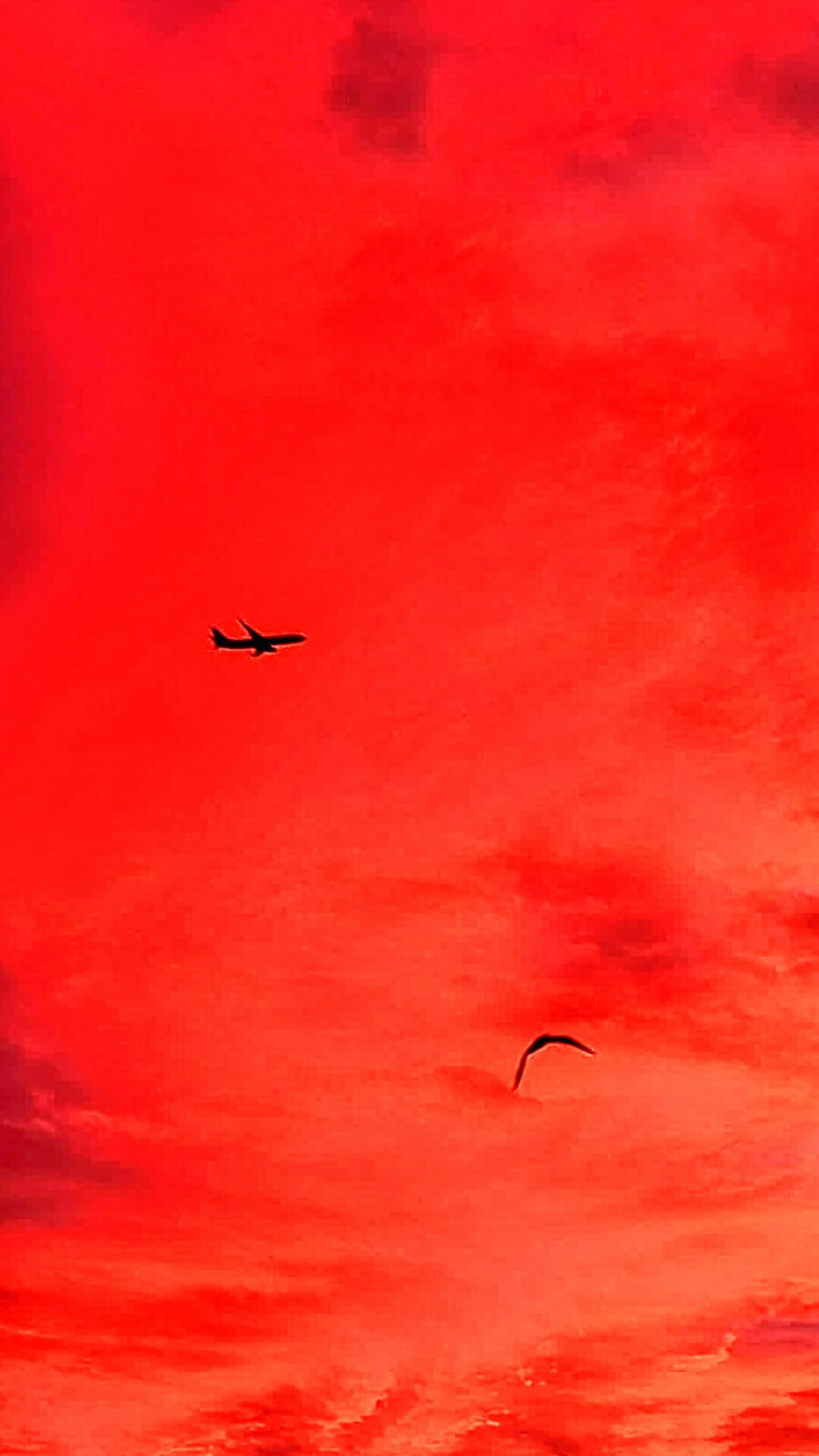 A jet airplane and a bird are silhouetted against a completely red sky. The cloud formations create subtle shifts in the red tones and add d…