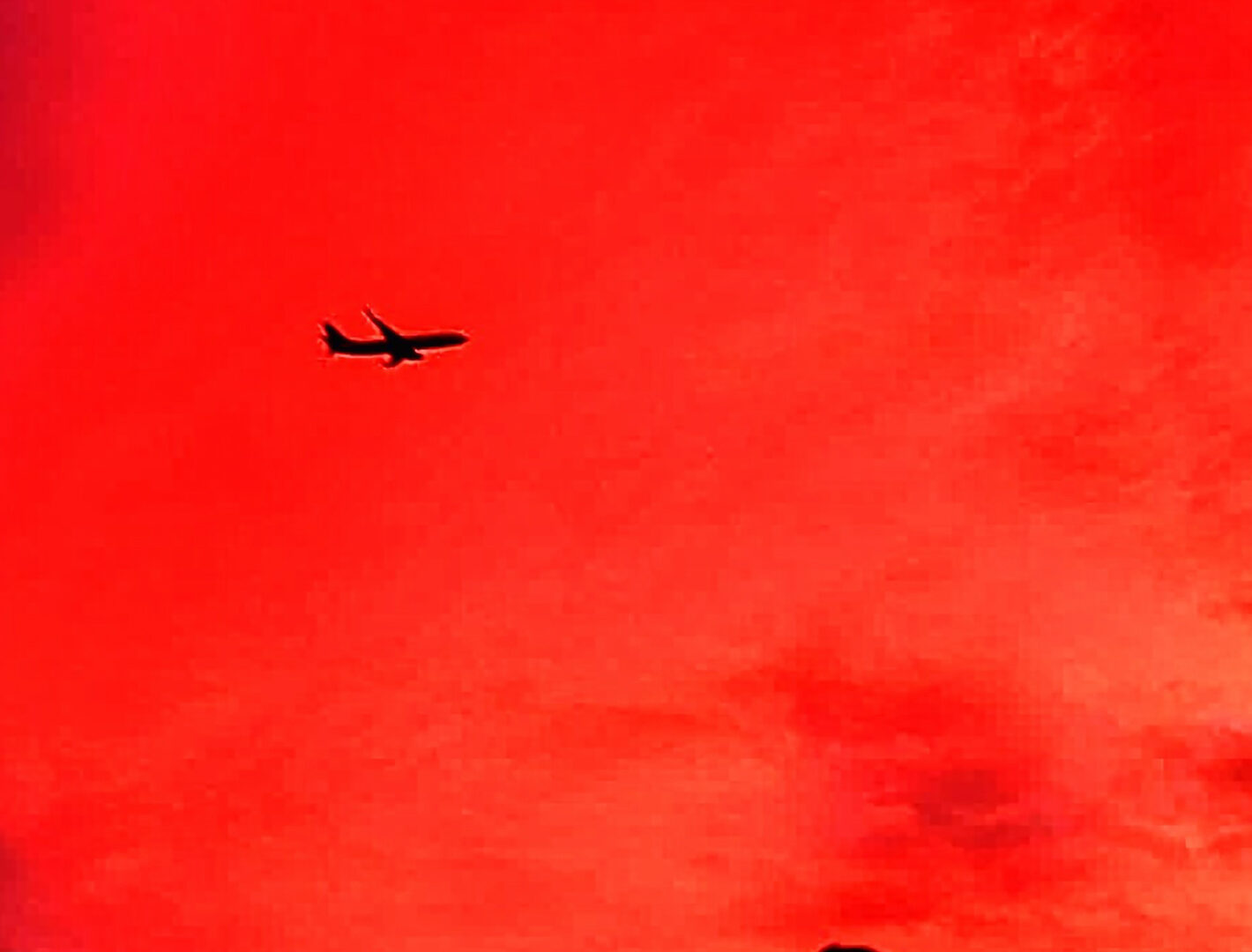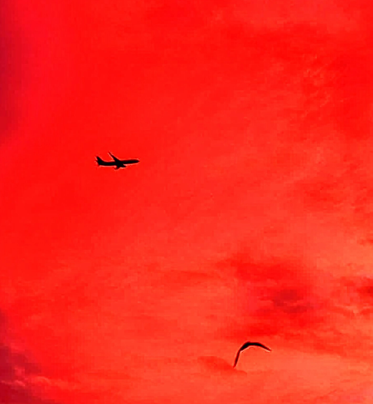 A jet airplane and a bird are silhouetted against a completely red sky. The cloud formations create subtle shifts in the red tones and add d