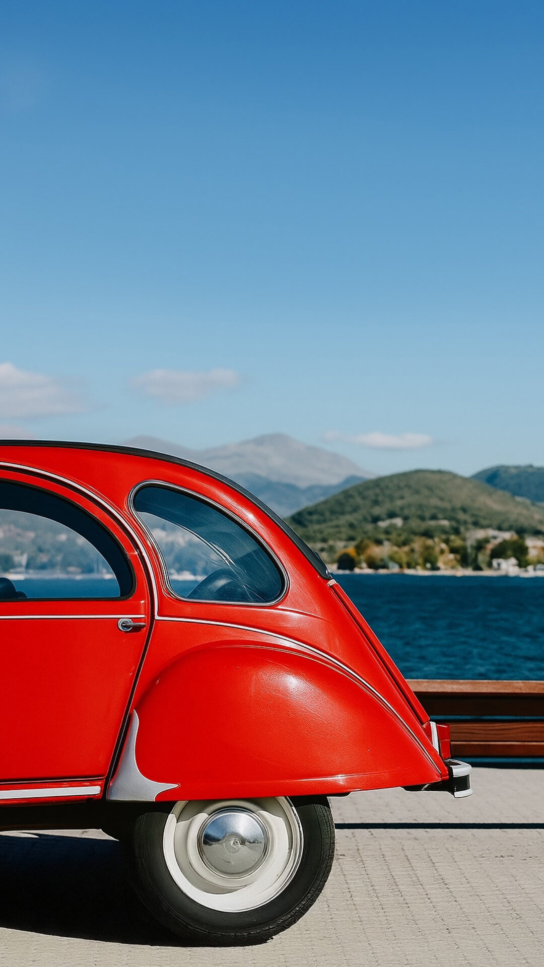 A red classic car is positioned facing left alongside a waterfront promenade. The glossy paint reflects the strong sunlight, contrasting wit…