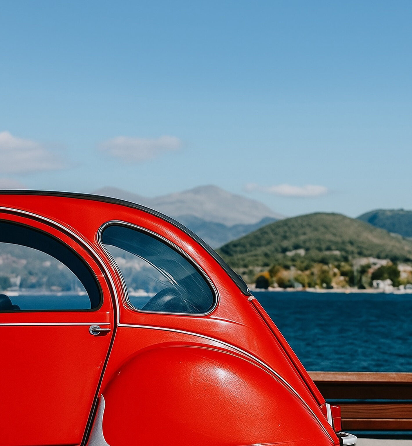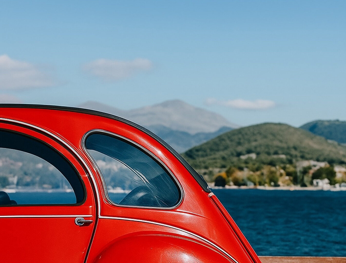 A red classic car is positioned facing left alongside a waterfront promenade. The glossy paint reflects the strong sunlight, contrasting with the muted tones of the distant hills and blue water.