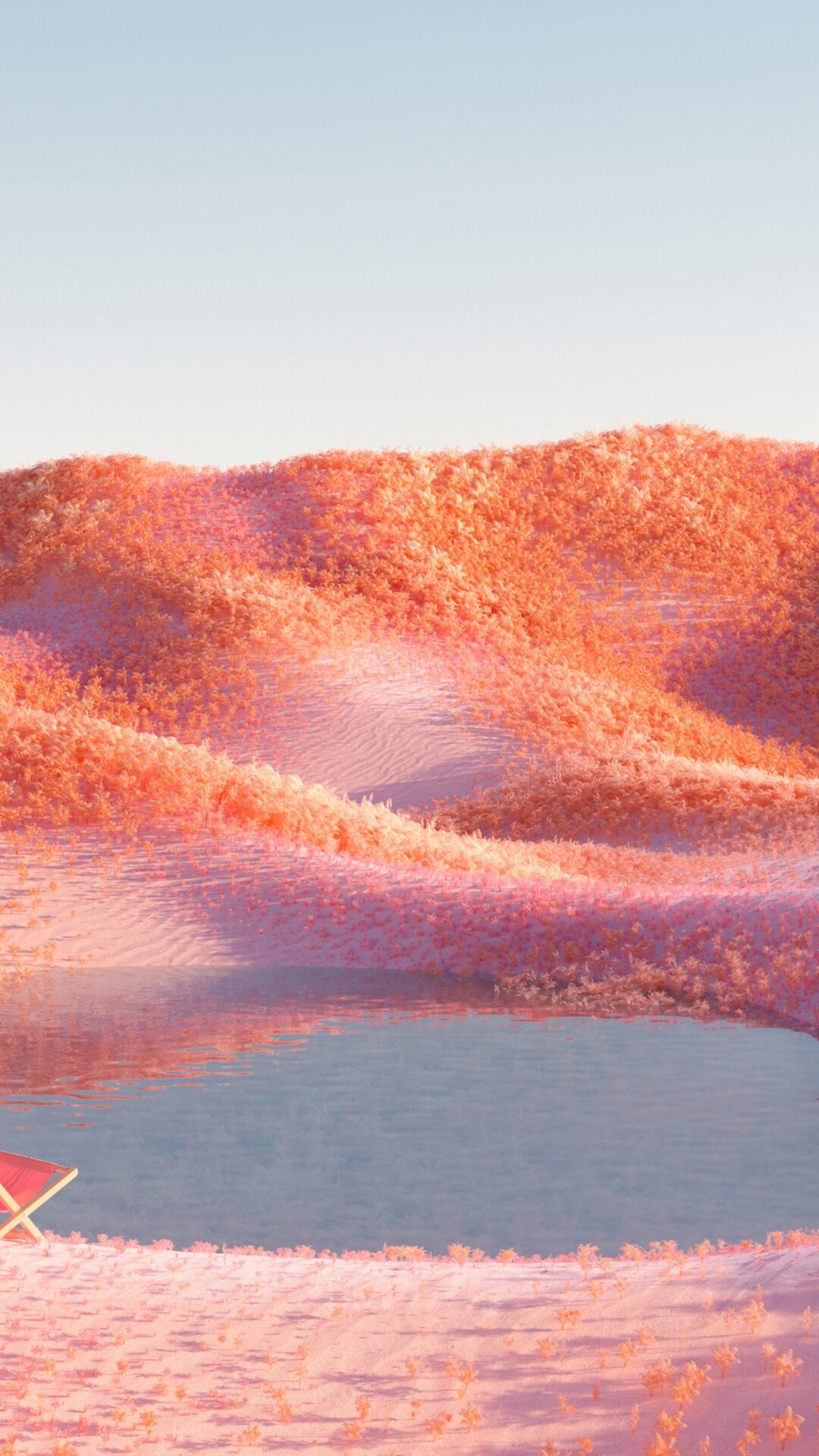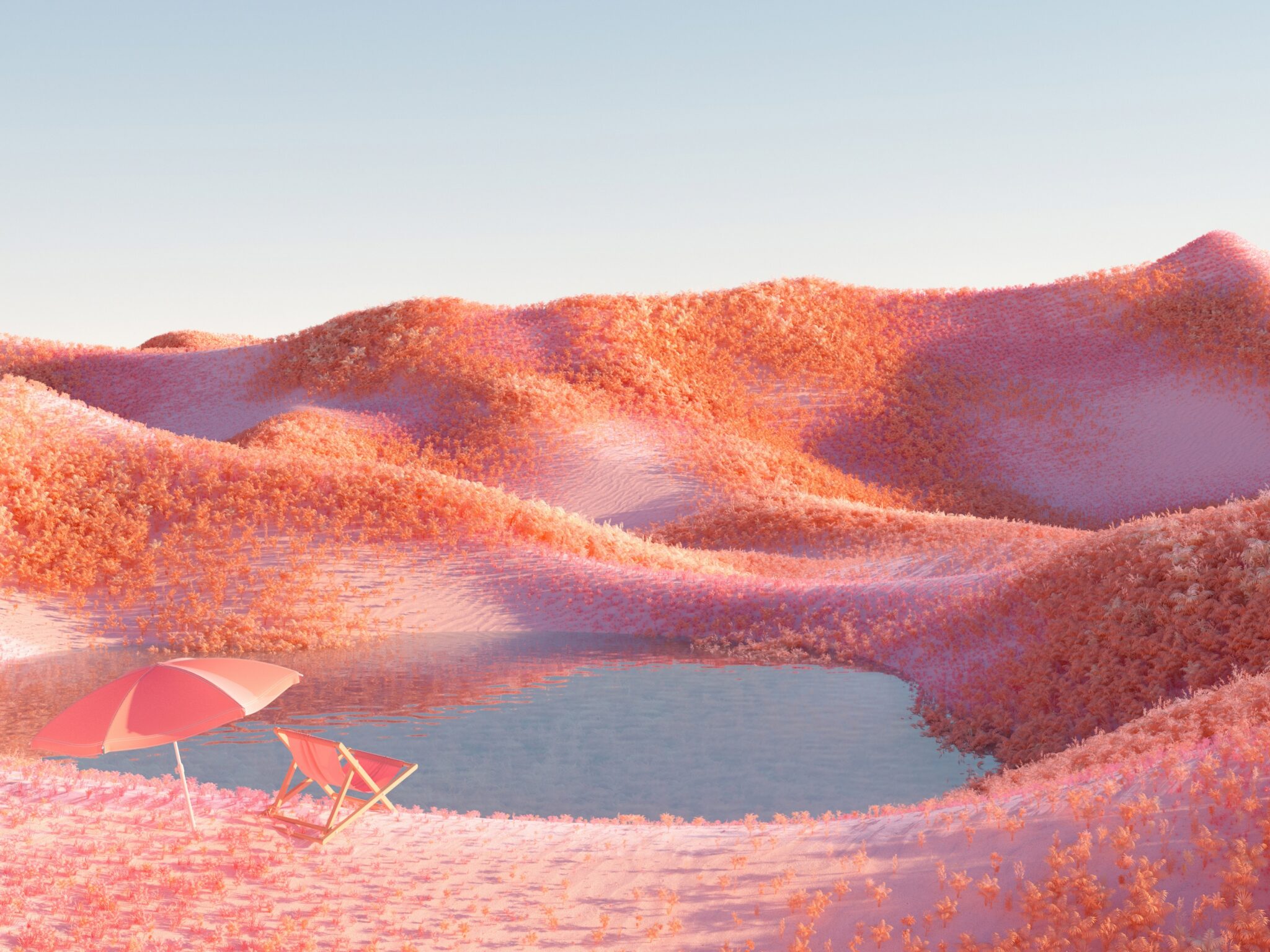 Rolling hills glow in vivid coral and magenta tones while a peaceful lake reflects the surreal infrared lighting, complete with a cozy umbrella and chair setup. This dreamy landscape wallpaper works beautifully for 4K desktop displays.