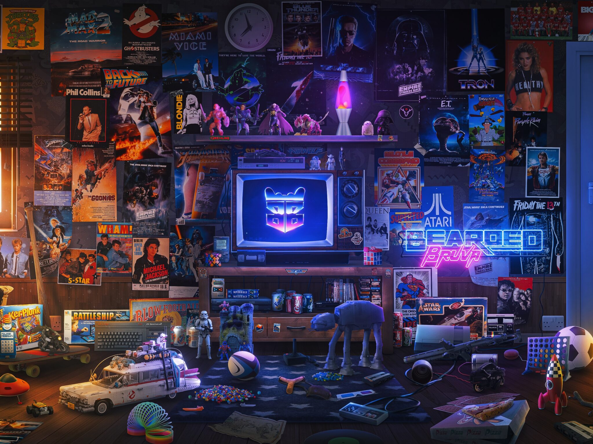 A densely packed room displays a collection of toys, posters, and electronics. The room is lit with neon glows and warm window light, creating a sense of nostalgic clutter.