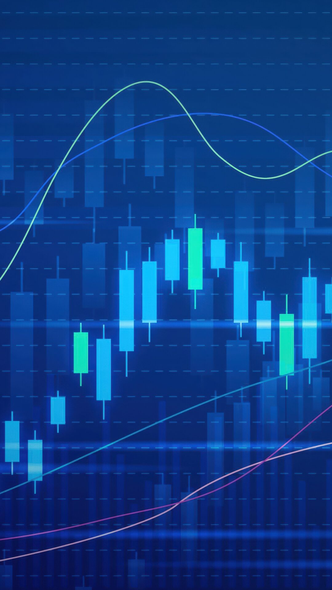 A financial stock chart is displayed with candlestick formations and overlaid trend lines. The deep blue background contrasts with the bright teal and red of the chart elements, suggesting a focused, upward momentum.