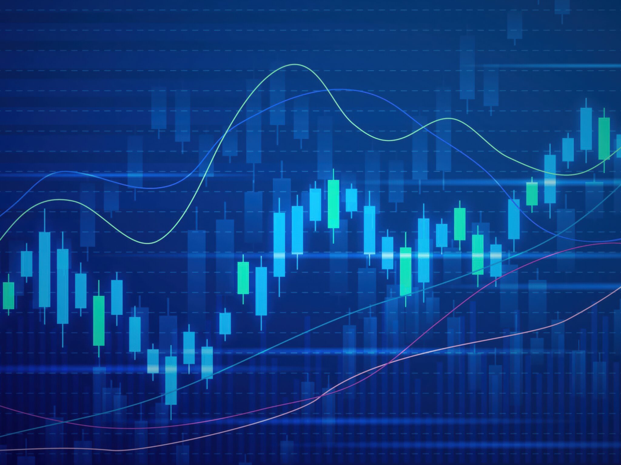 A financial stock chart is displayed with candlestick formations and overlaid trend lines. The deep blue background contrasts with the brigh…