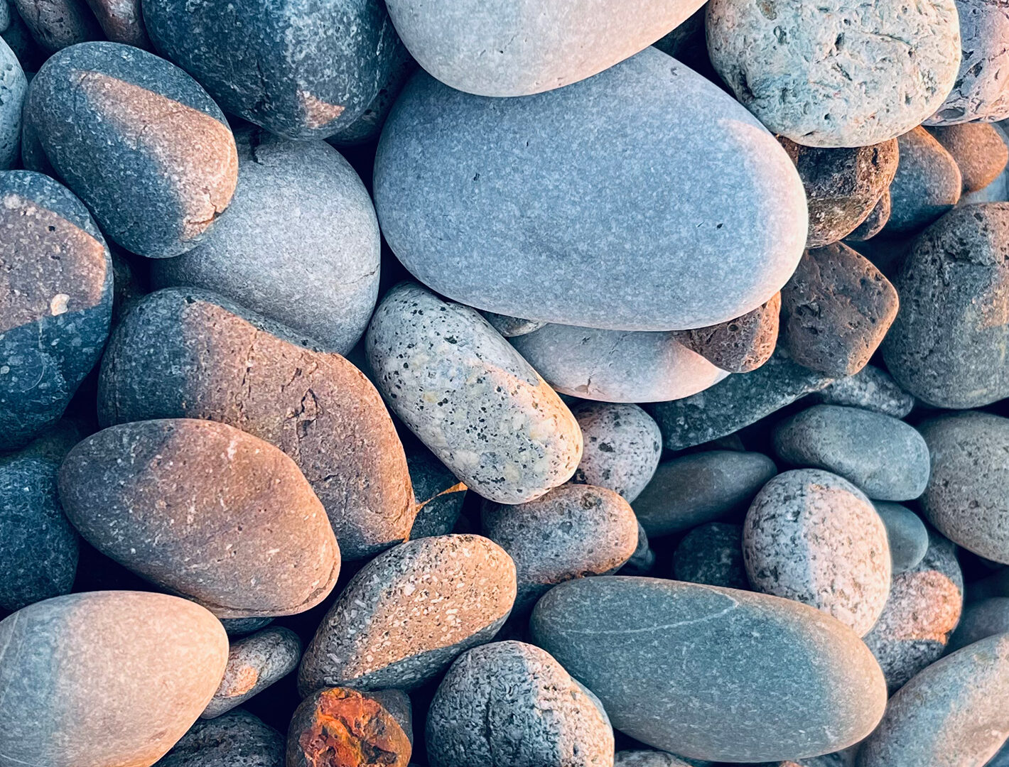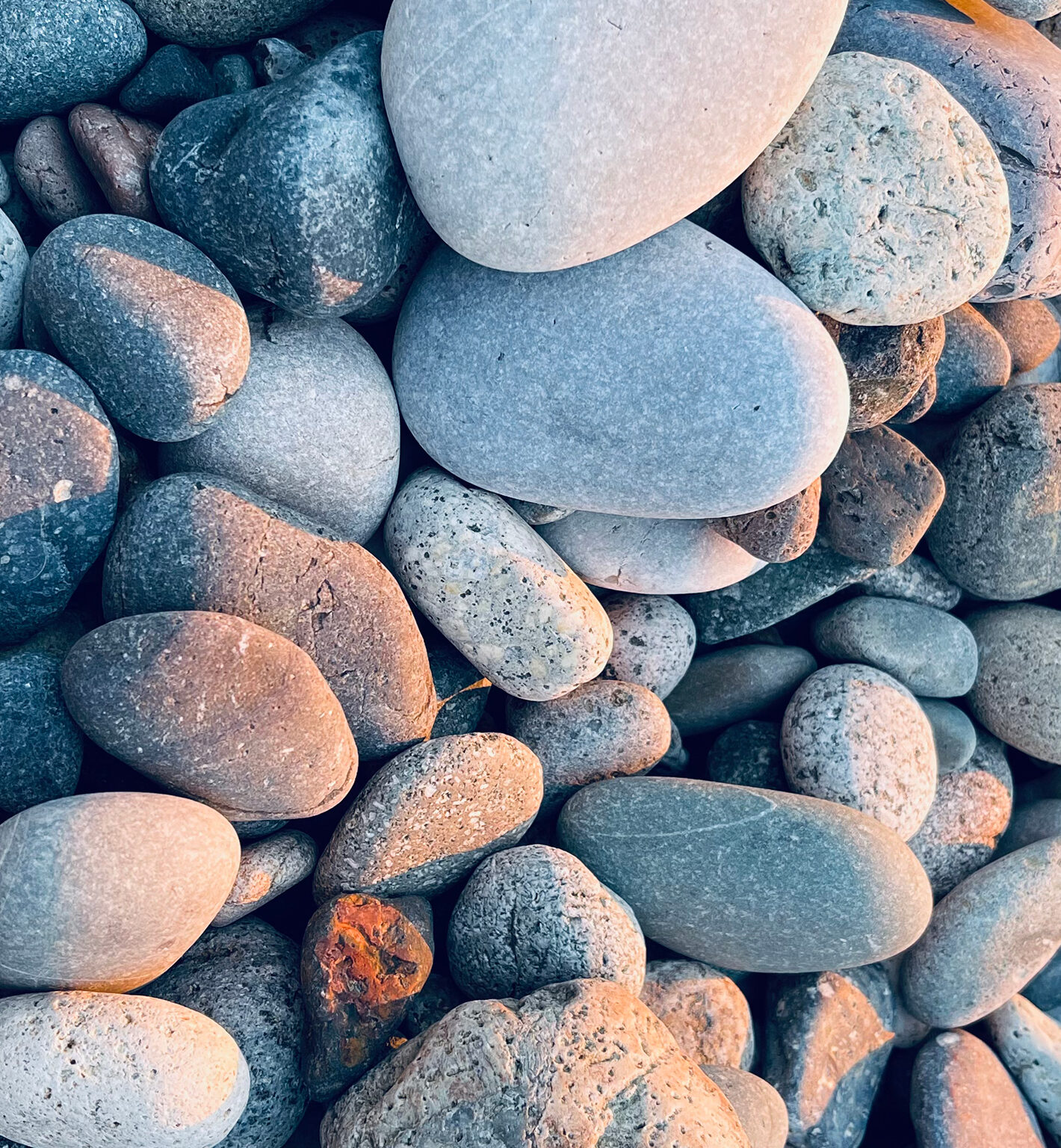 Smooth, rounded rocks fill the frame in a tightly packed composition. Pale grey and brown tones are highlighted by soft, directional lightin