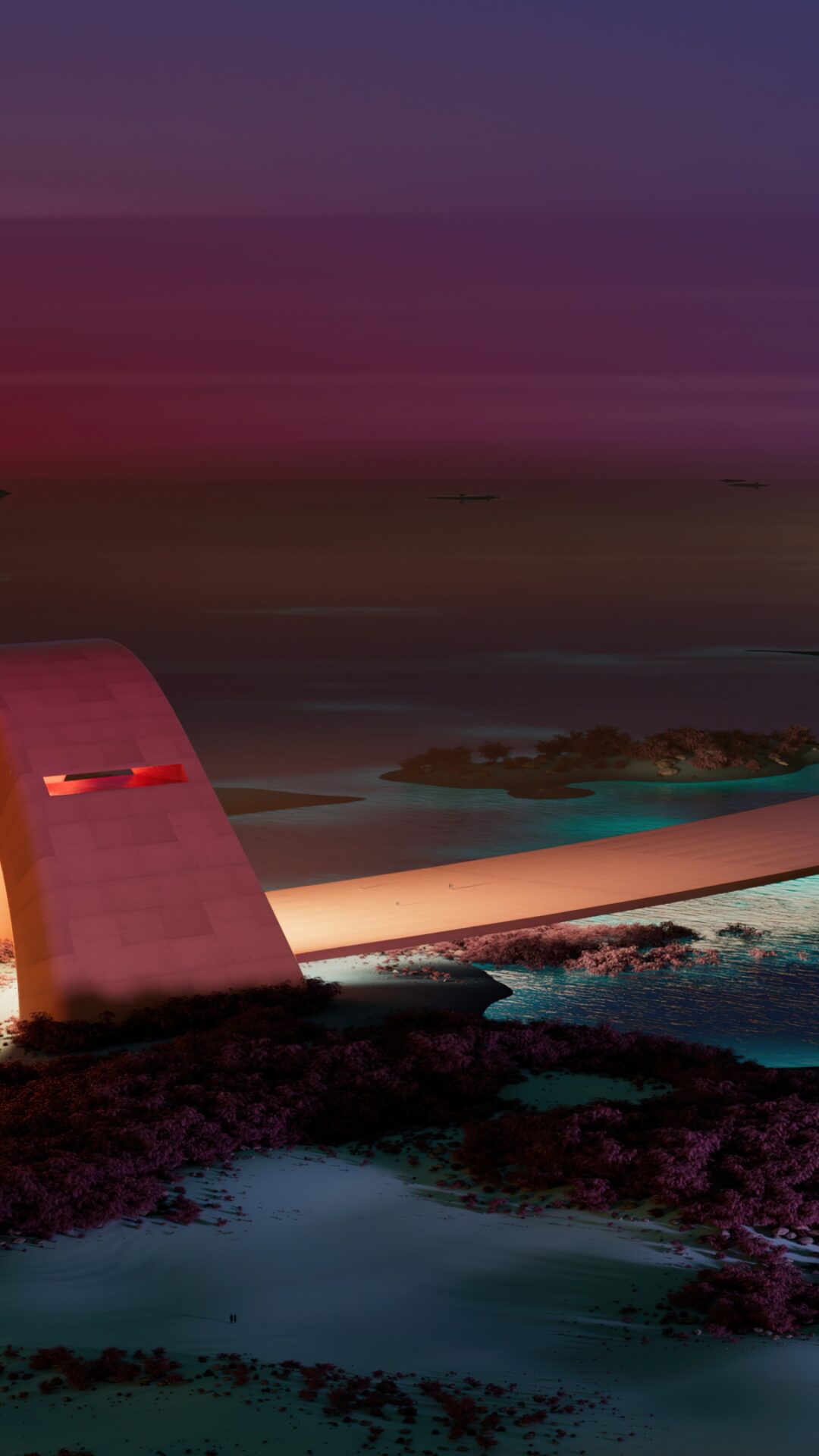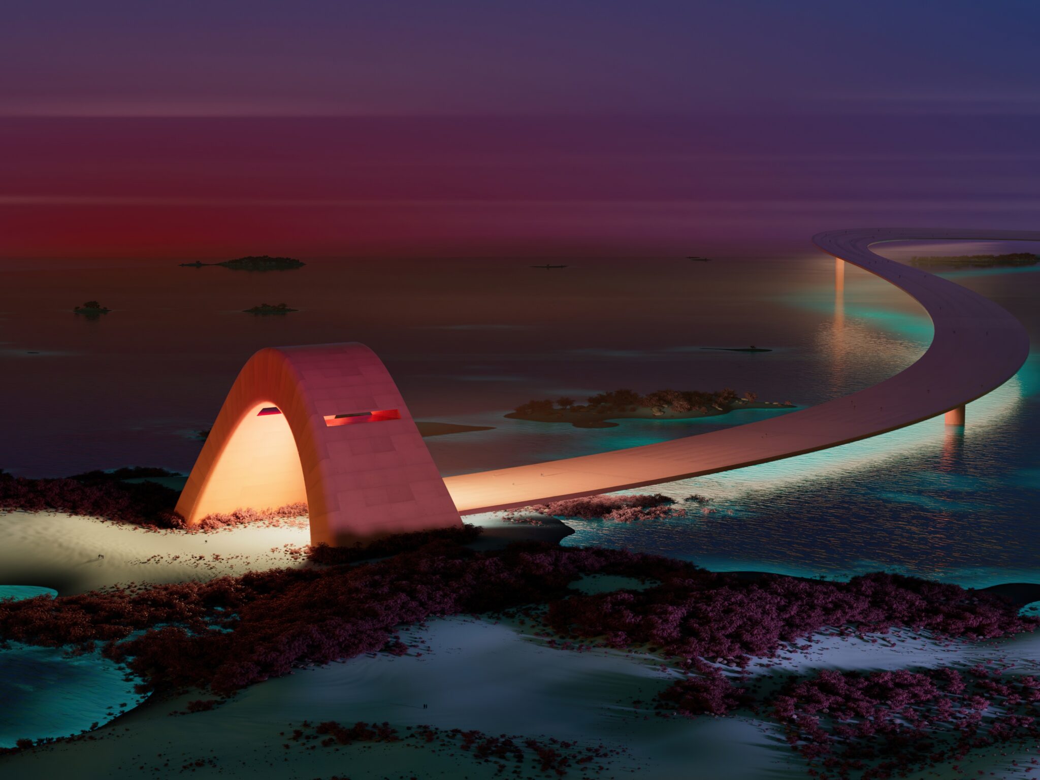 A curved road passes through a concrete archway over dark water and rocky terrain. The structure glows with warm interior light against a cool purple and teal sky.