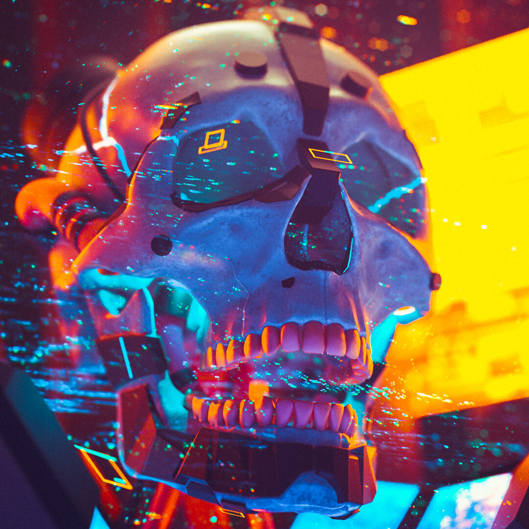 A hyper-detailed mechanical skull rendered in silver chrome, bolted plating, and razor-sharp teeth explodes against a neon wash of orange, b…