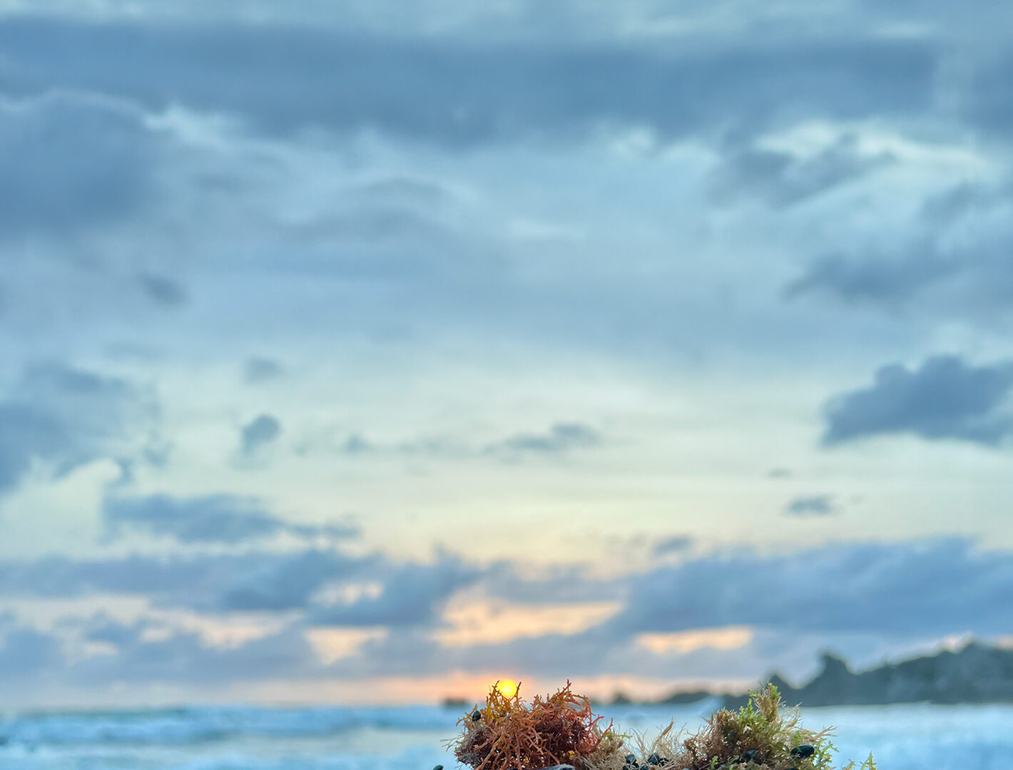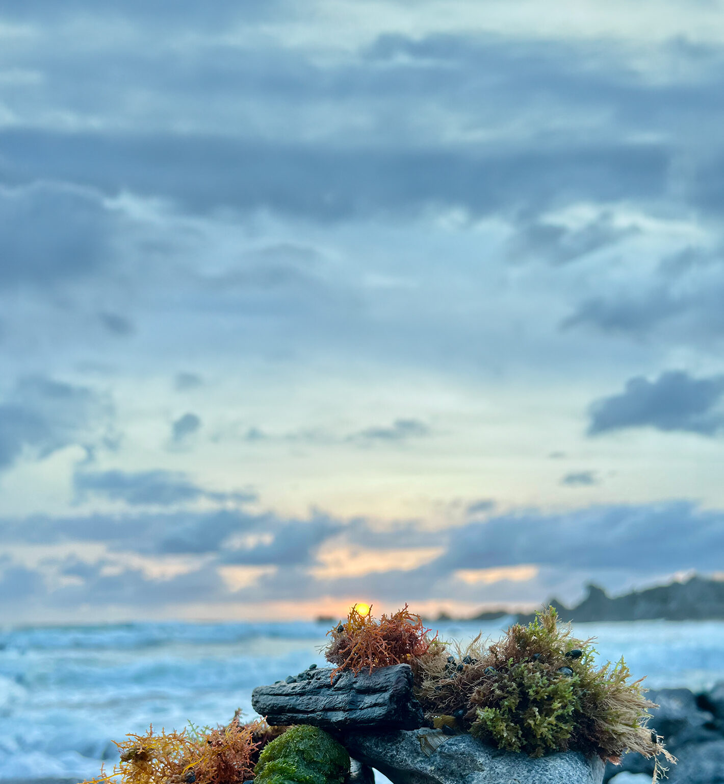 Stacked rocks sit on a dark, pebble beach facing a distant ocean horizon. Warm orange light from the setting sun creates a soft glow against…