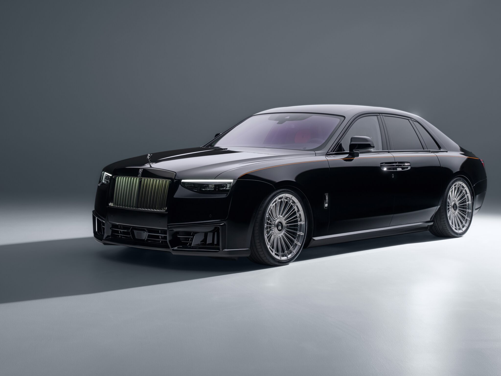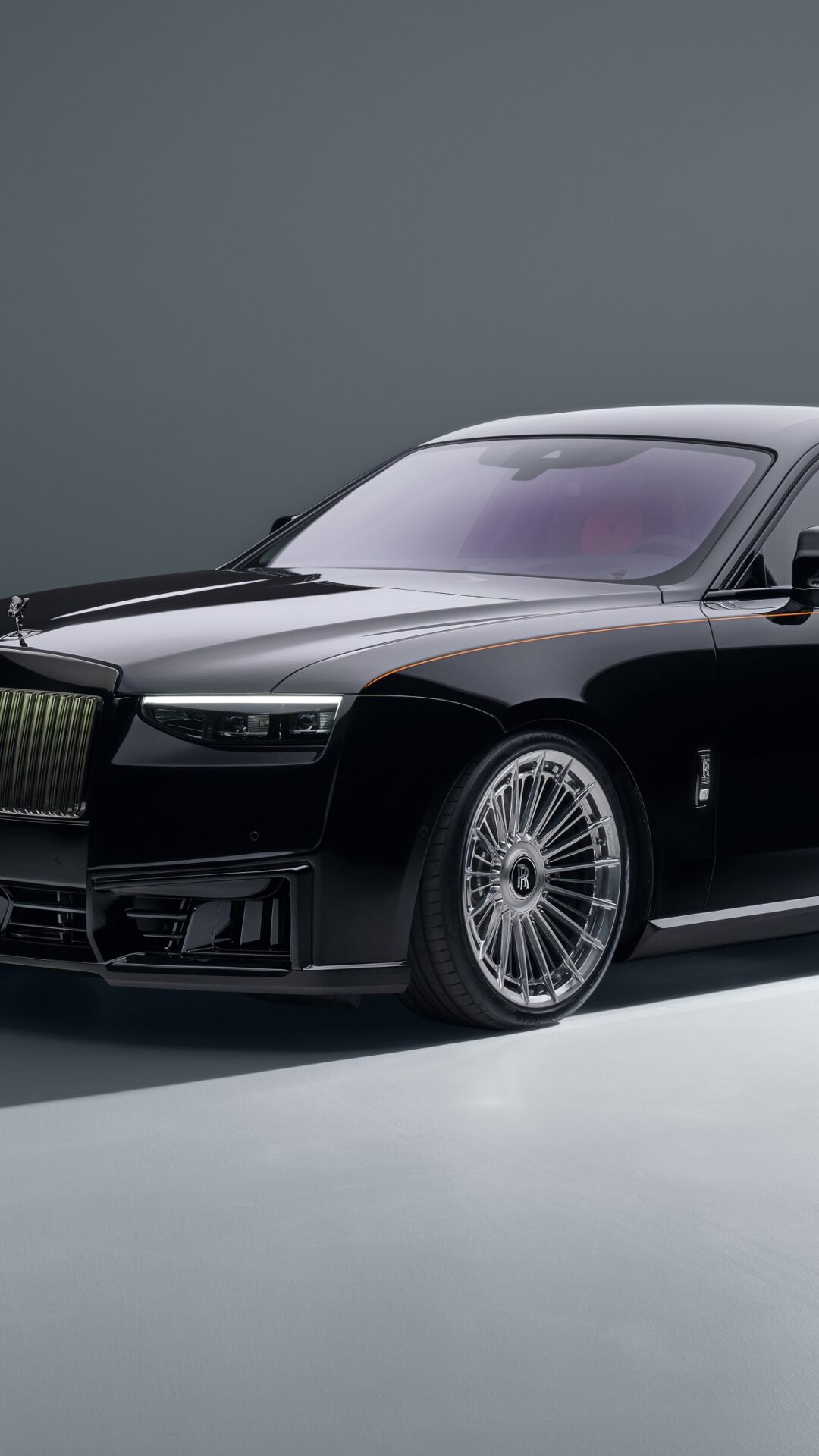 A black Rolls-Royce Phantom sedan is positioned on a light gray surface against a dark gray backdrop. Soft, diffused lighting highlights the car’s polished surfaces and creates a long, dramatic shadow.
