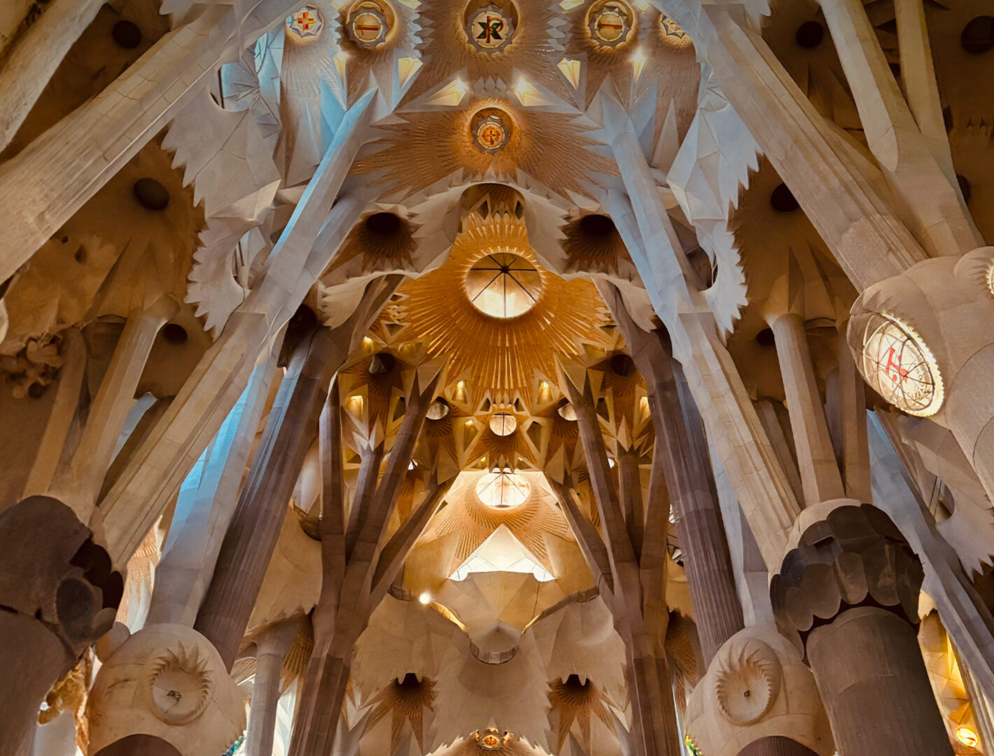 An upward view of the Sagrada Familia’s interior shows a forest of stone columns and the vaulted ceiling. Light from stained glass windows casts colorful shadows onto the textured stone surfaces and creates depth.