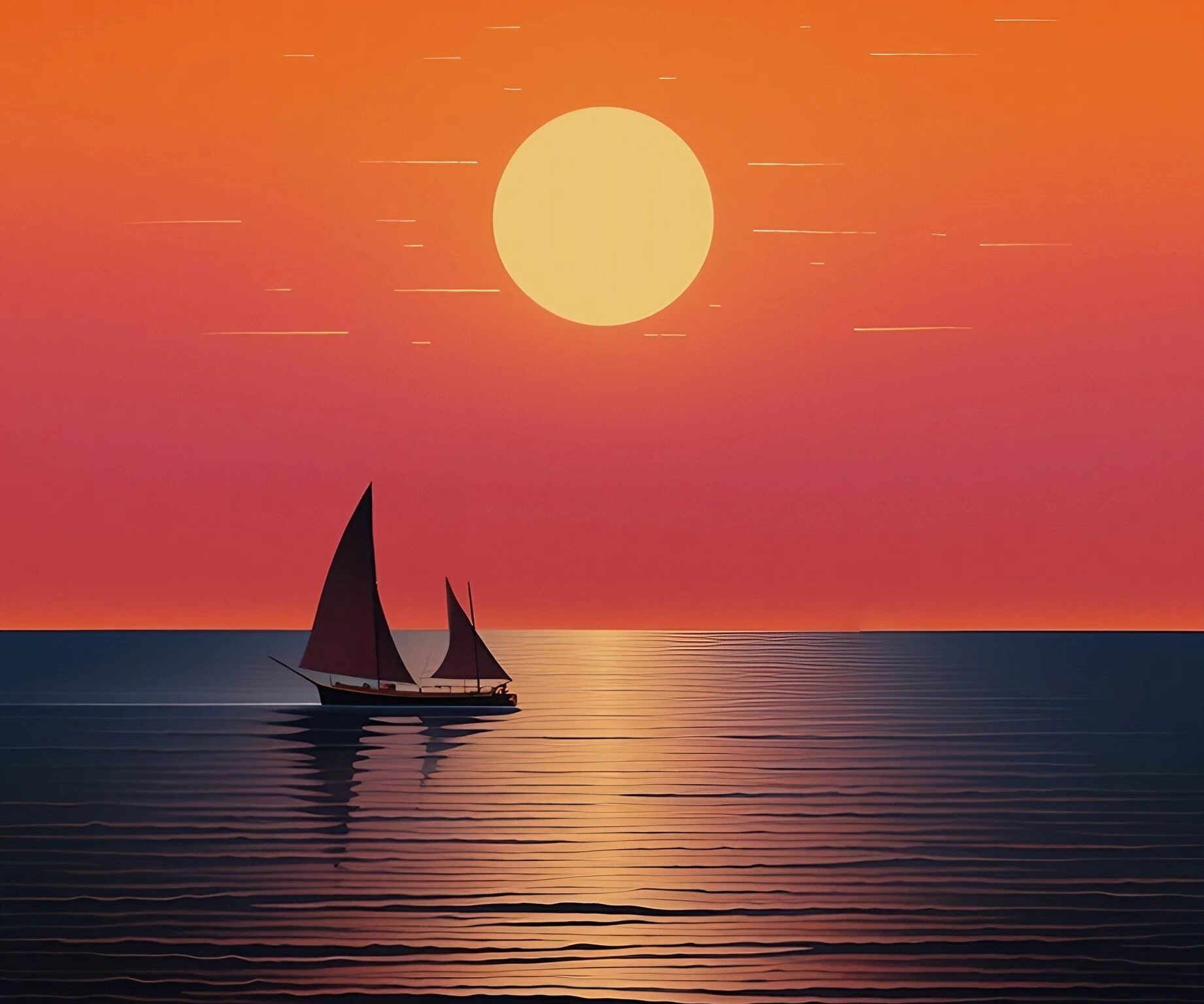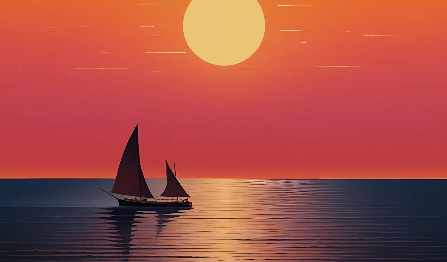 Two sailboats are centered on the water below a bright sun and gradient sky. The water's surface reflects the orange and yellow light, creat…