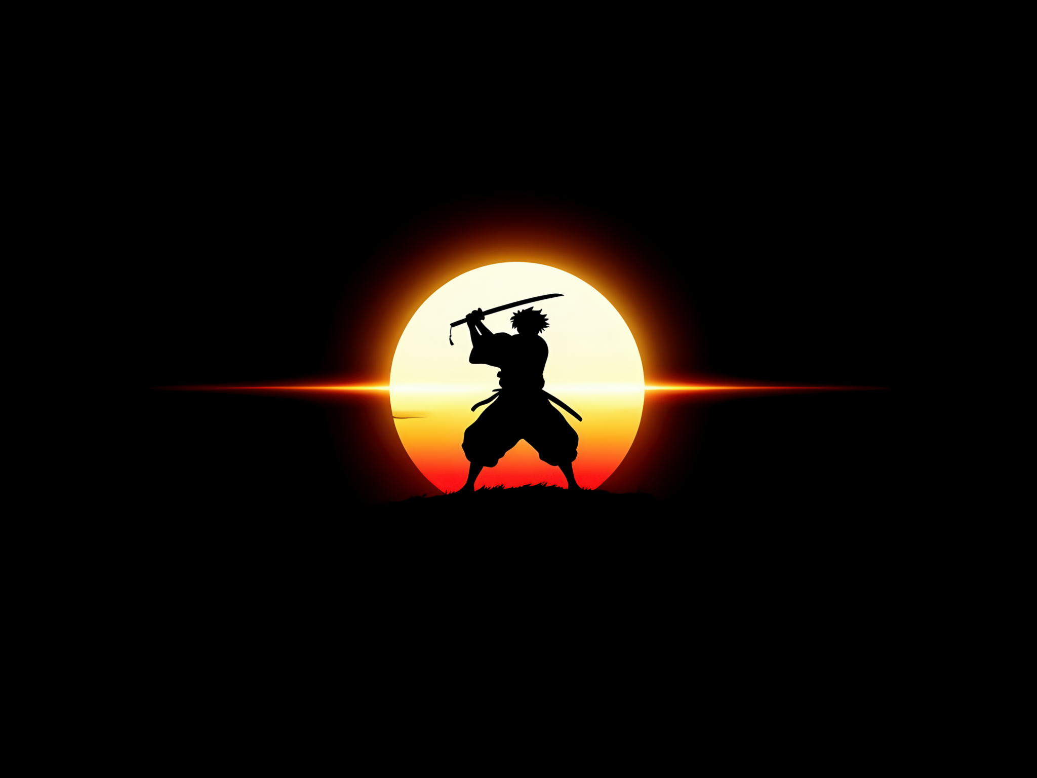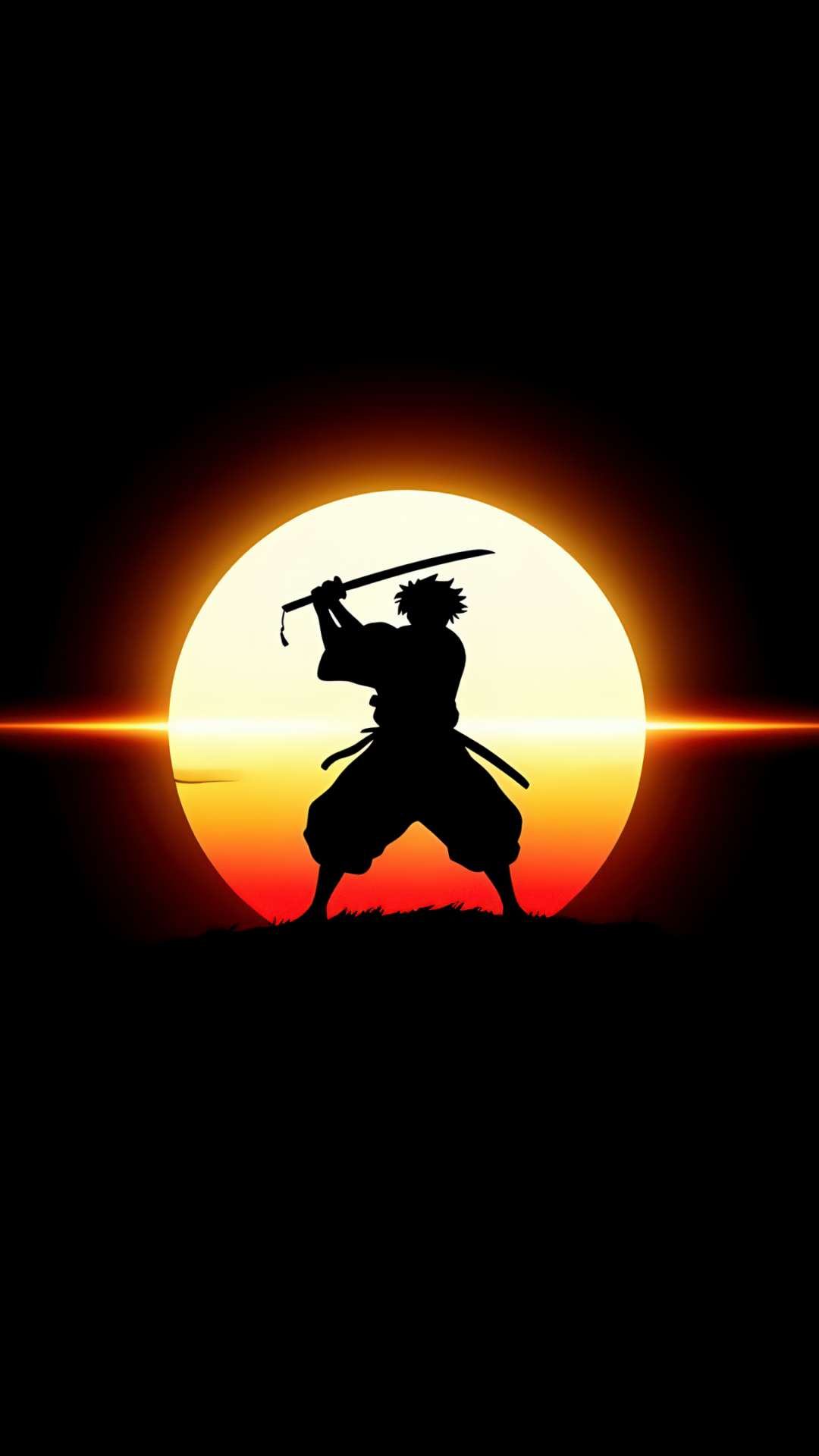 Samurai silhouette in a powerful stance against a glowing sun that shifts from pale yellow to deep orange and red, all set on pure black. Fo…