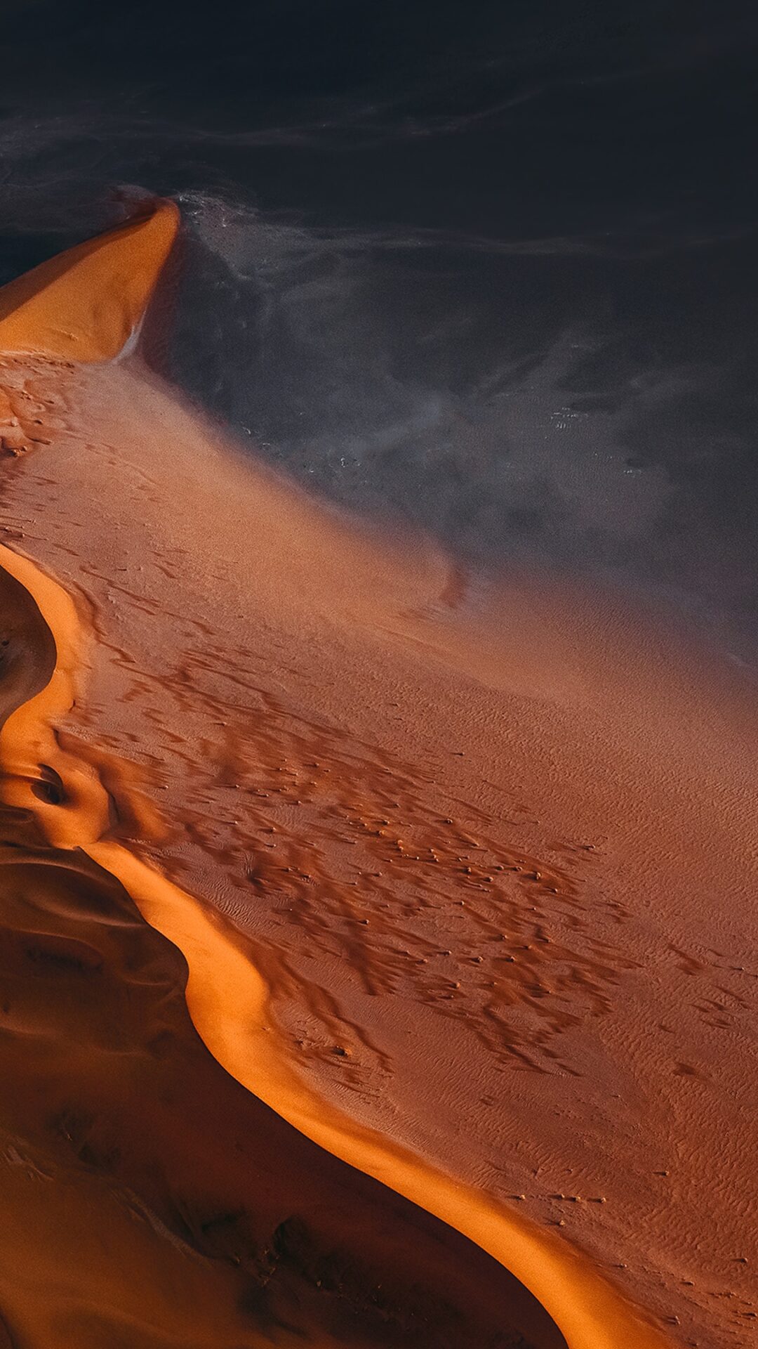 An aerial view shows curving sand dunes in a desert landscape. Warm orange light highlights the textured ripples across the sand's surface, …