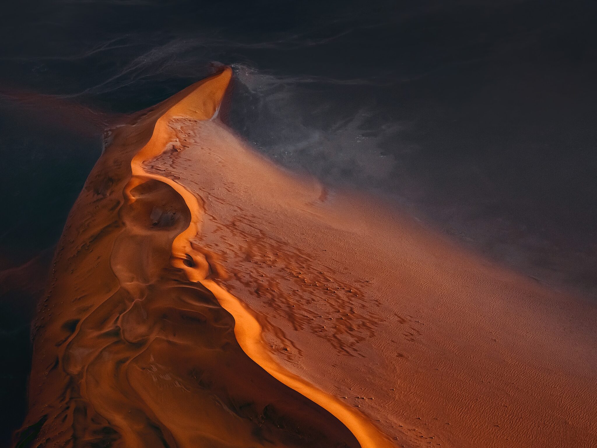 An aerial view shows curving sand dunes in a desert landscape. Warm orange light highlights the textured ripples across the sand's surface, creating a sense of depth.