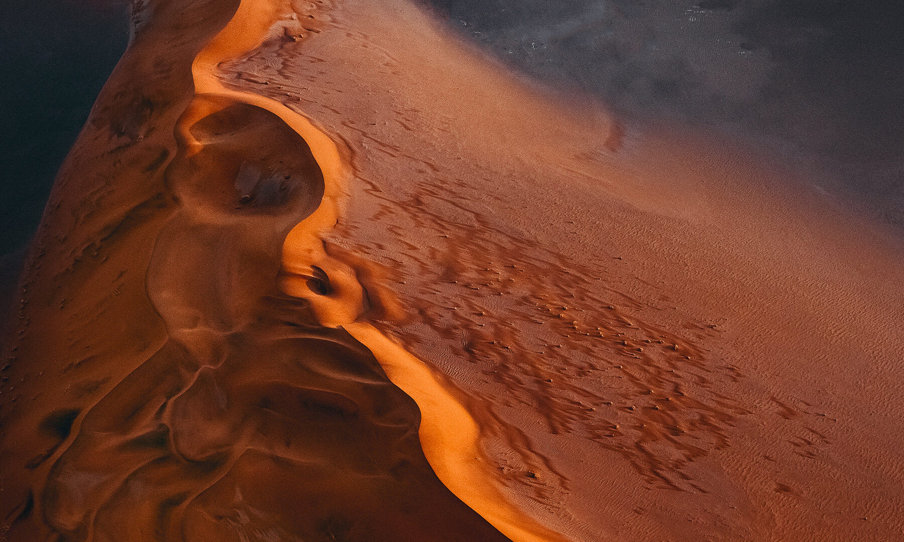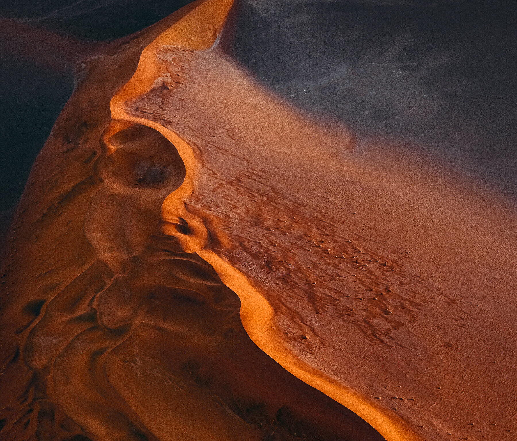 An overhead view depicts the sweeping curves of orange sand dunes against a dark sky. The low angle light emphasizes the texture and deep shadows across the undulating surface.