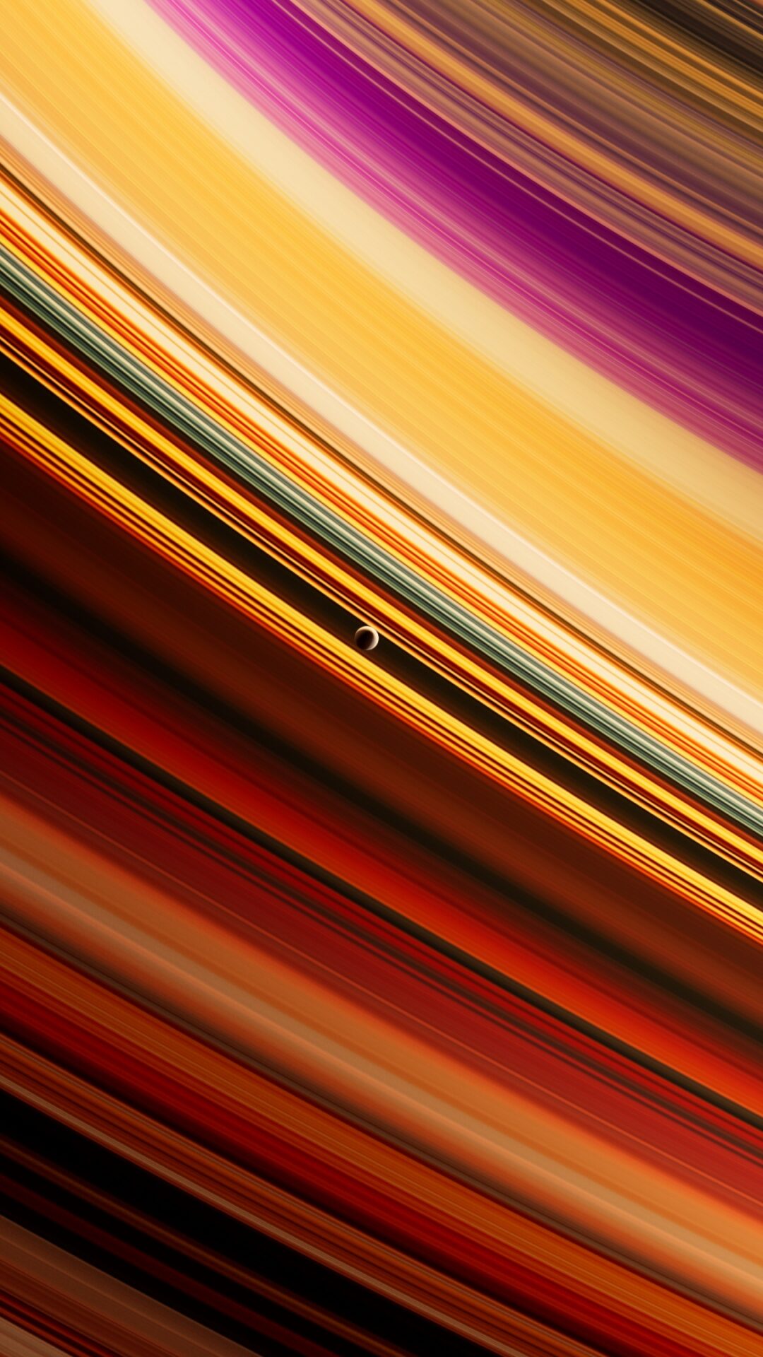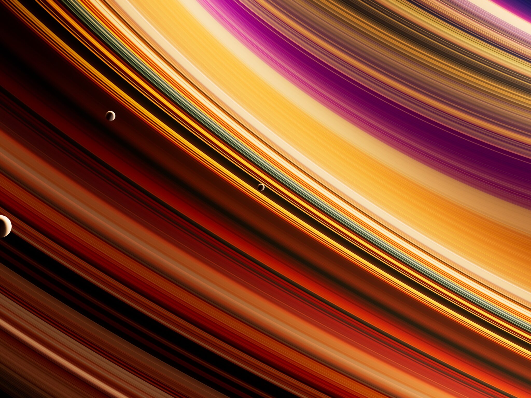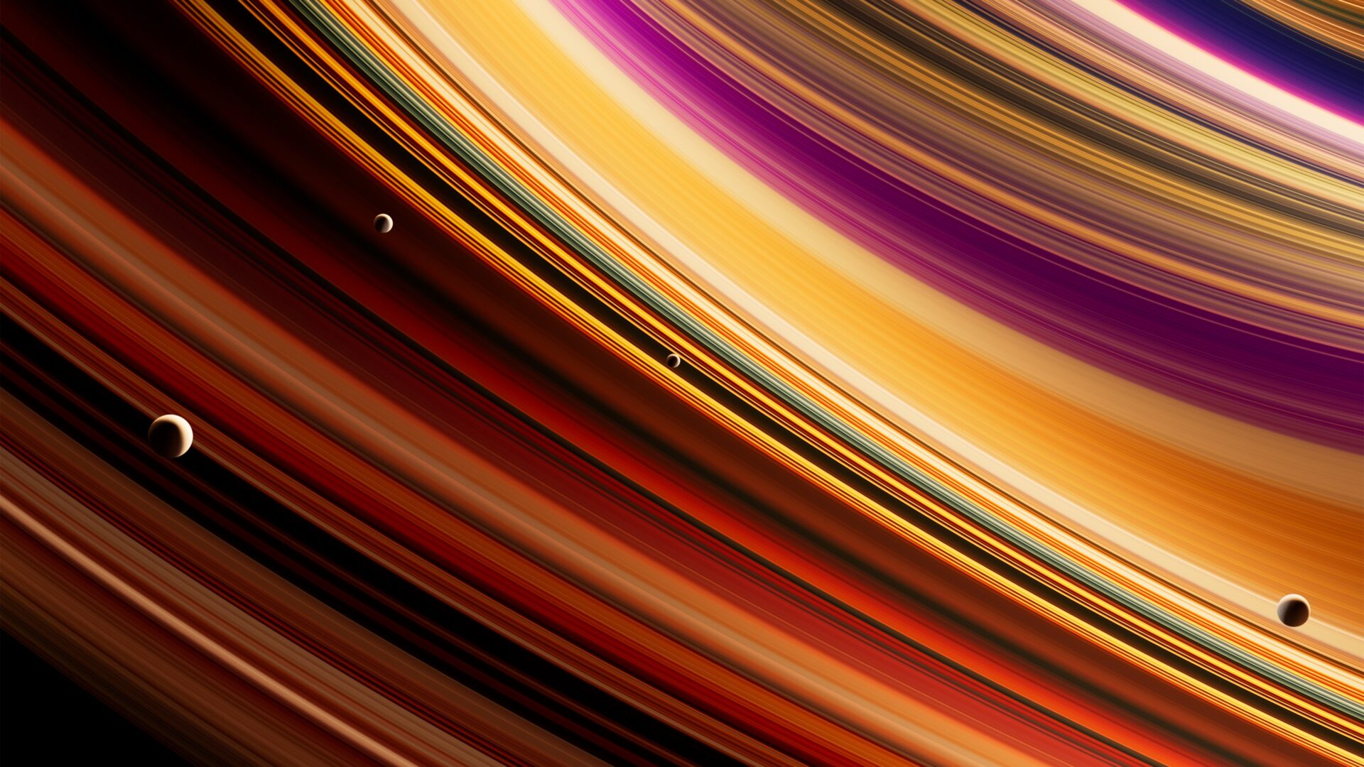 Vibrant orbital rings sweep across the frame in brilliant oranges, deep purples, and golden yellows with small celestial bodies floating among the colorful bands. This cosmic wallpaper works beautifully on 4K monitors and ultrawide displays.
