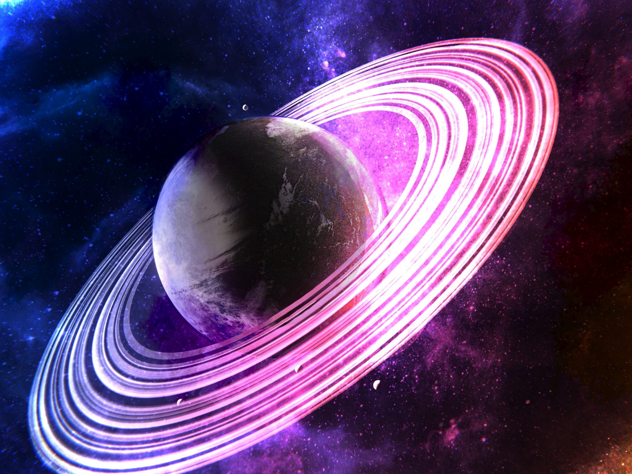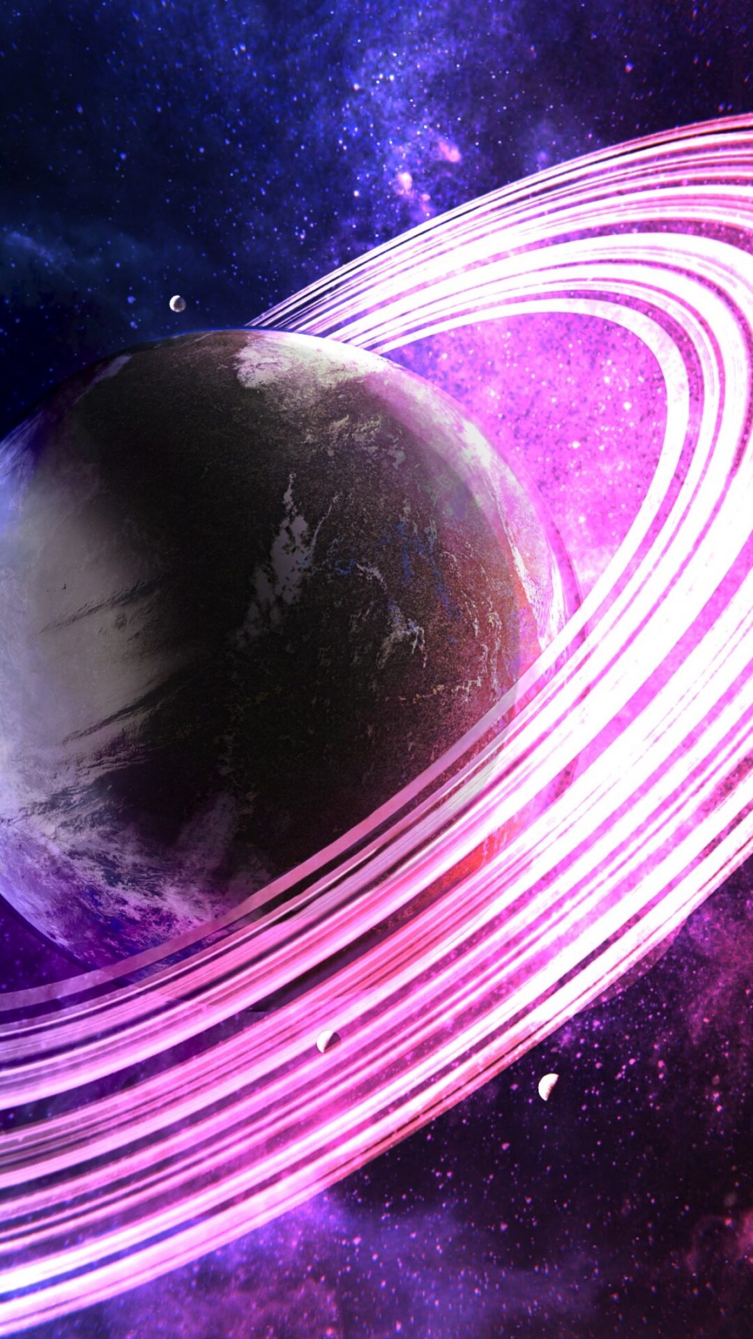 This dreamy space scene shows a Saturn-like planet with glowing pink and purple rings floating against a vibrant nebula backdrop of deep blu…