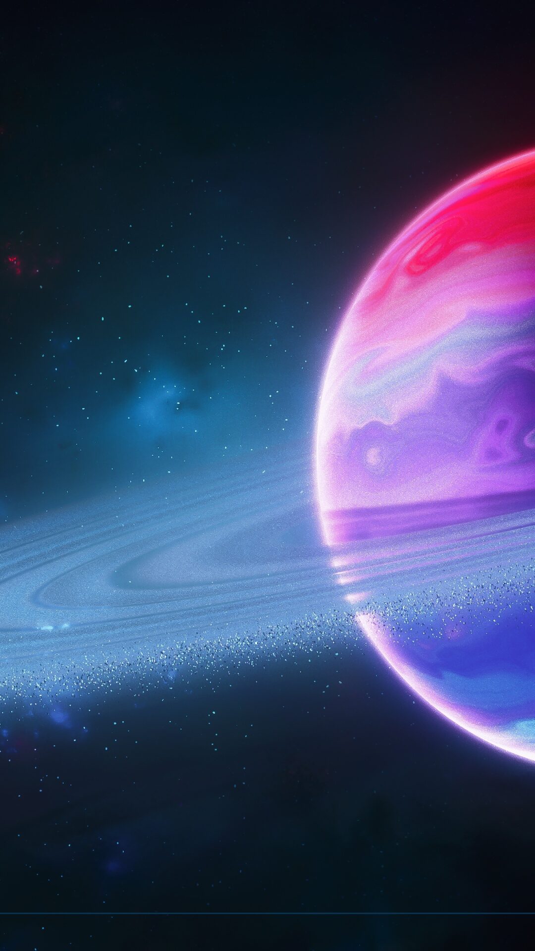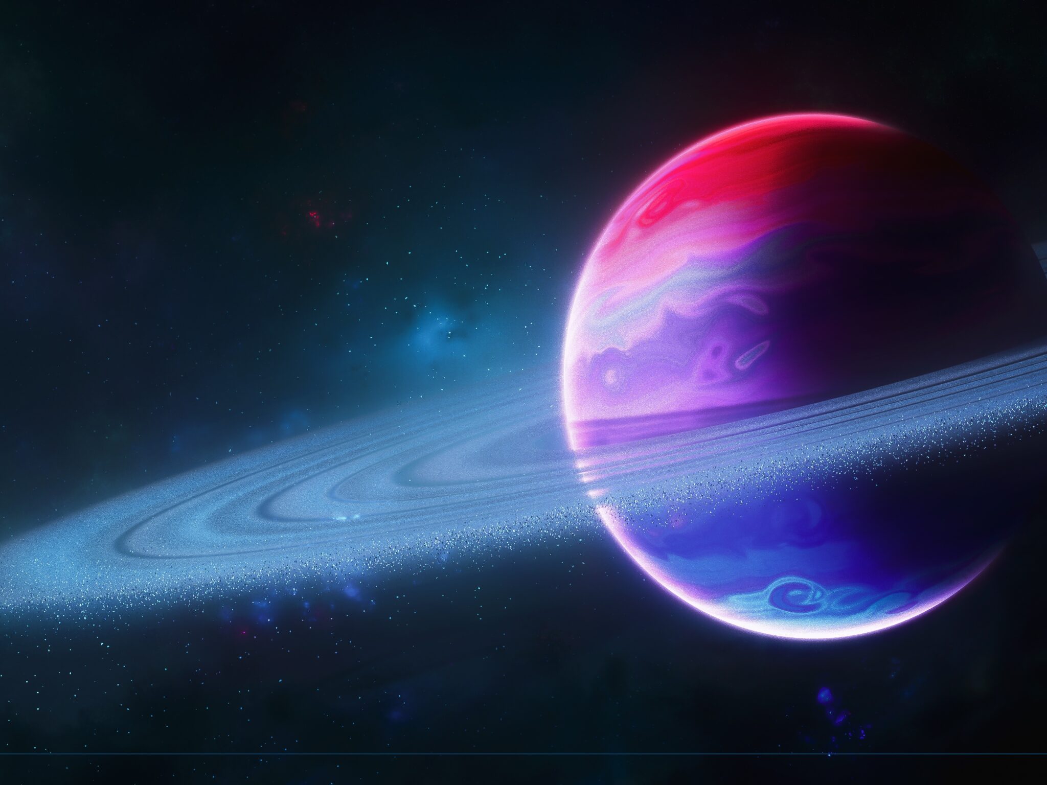 Vibrant planetary rings sweep across space in brilliant blues and purples, with a glowing red and violet gas giant emerging from the cosmic …