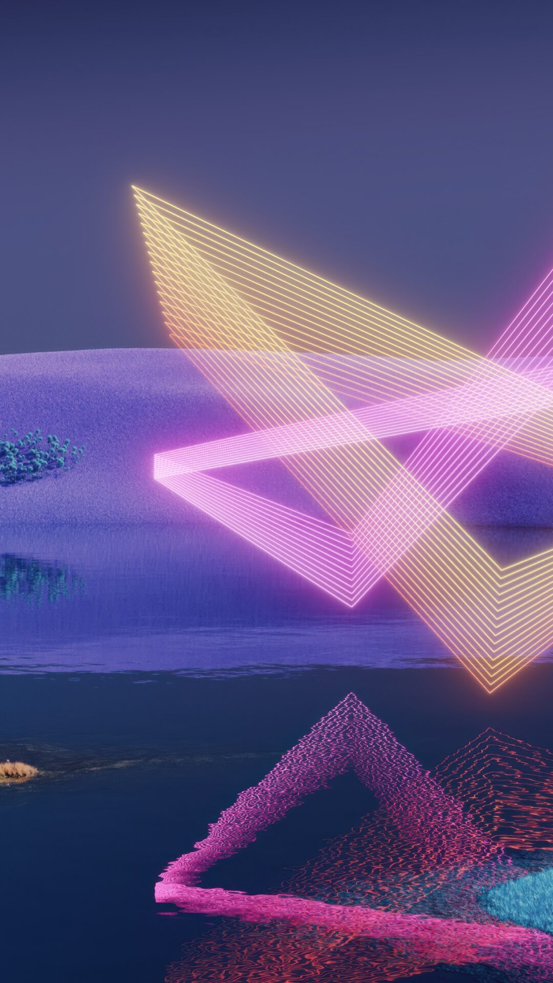 Glowing neon triangles in pink and golden yellow float above a surreal blue landscape with a calm lake reflecting the geometric shapes below…