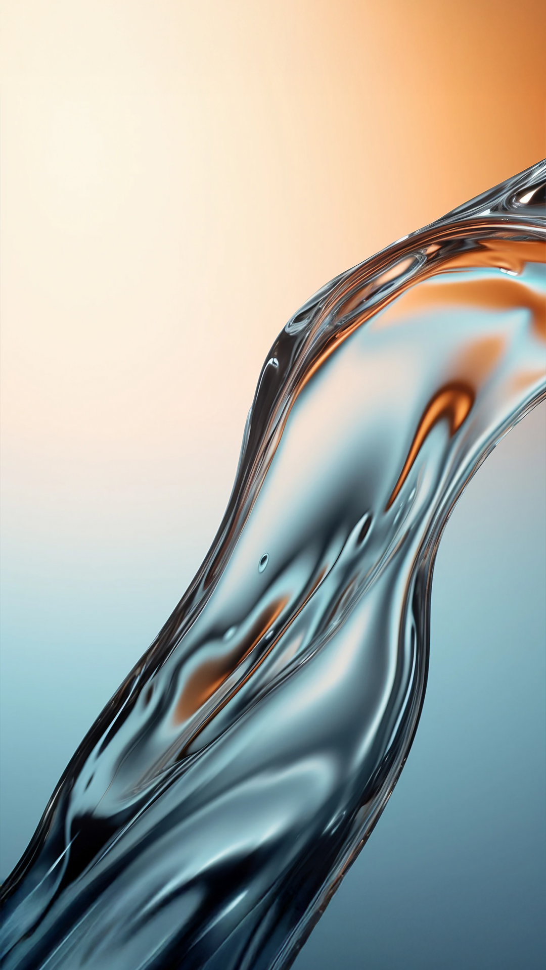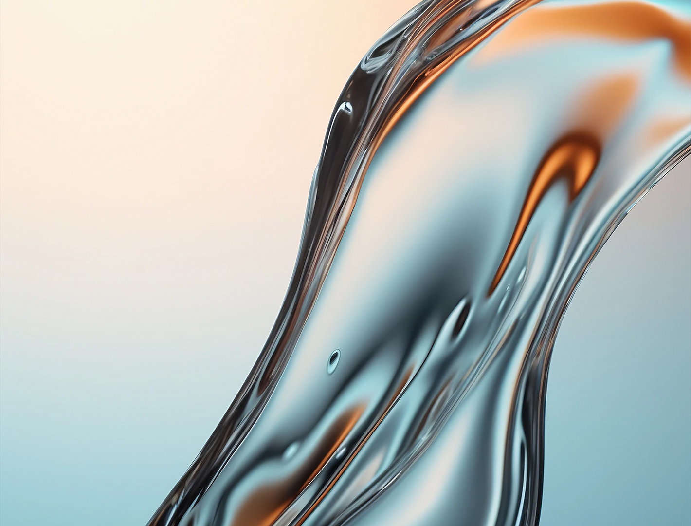 A close-up displays a swirling, metallic fluid form against a gradient background. Reflections and light play across the polished surface, creating a sense of smooth depth.