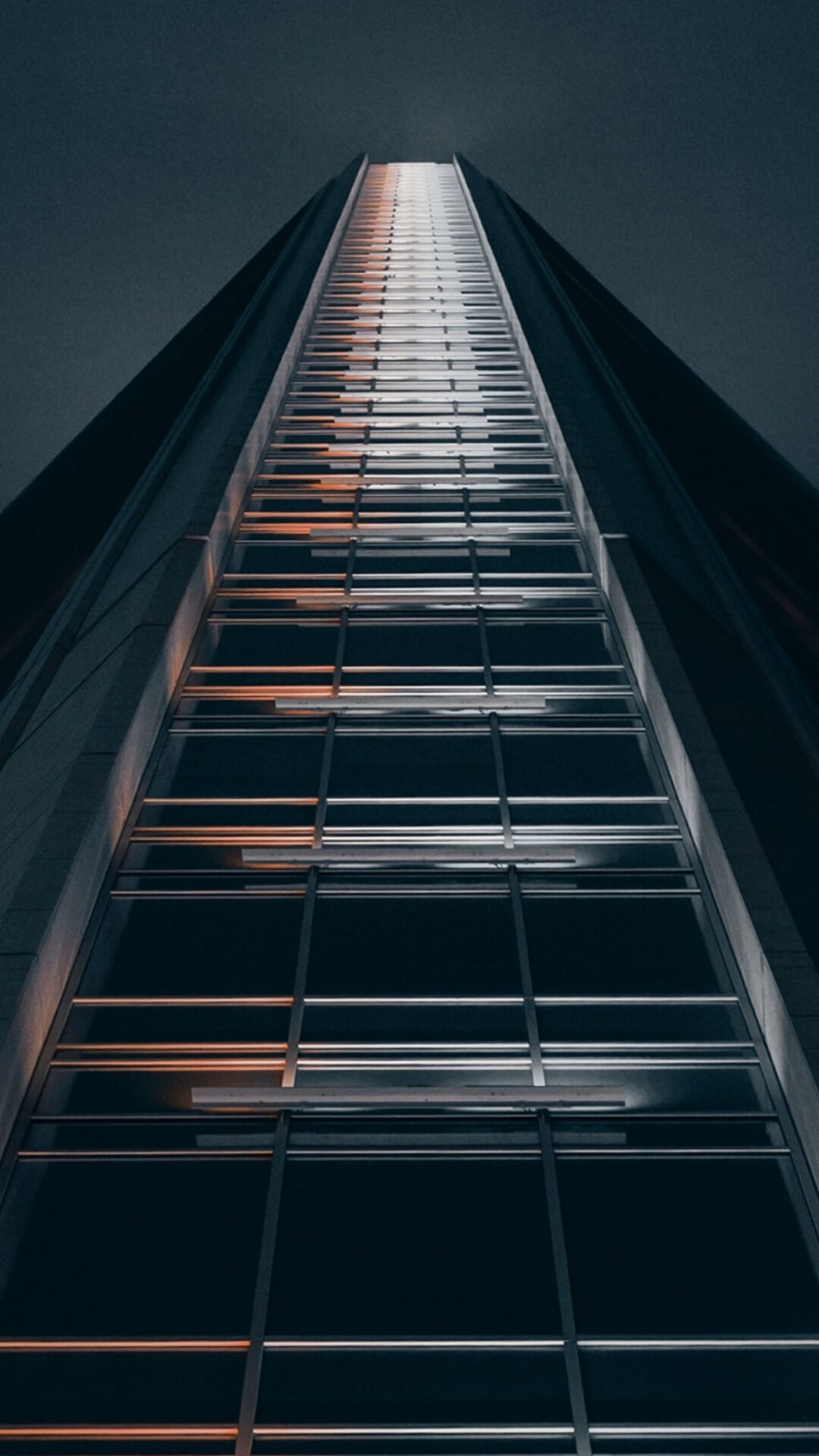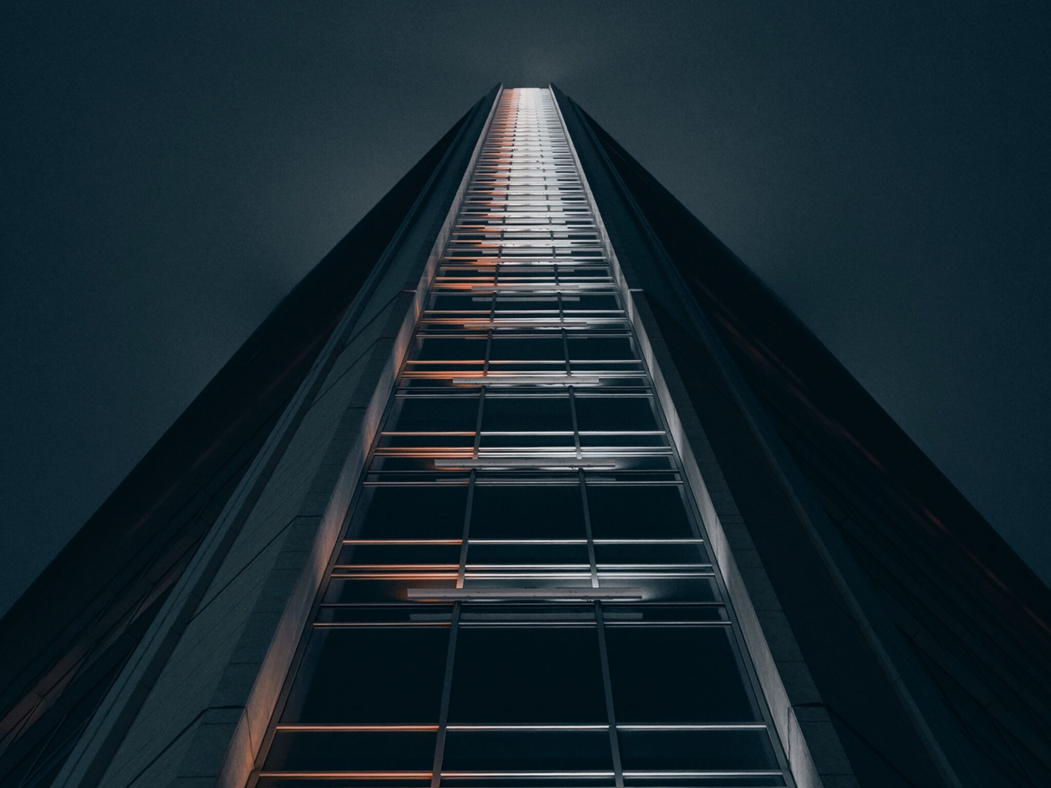 A tall building rises into a dark sky, framed from a low angle. Reflected light creates warm highlights across the cool gray glass facade.