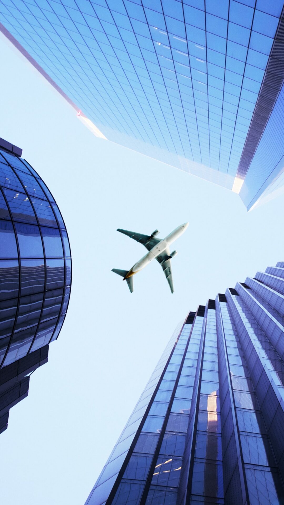 A jet airplane flies centrally between tall, glass skyscrapers viewed from a low angle. The clear blue sky and reflective glass surfaces create a feeling of spaciousness and linear perspective.