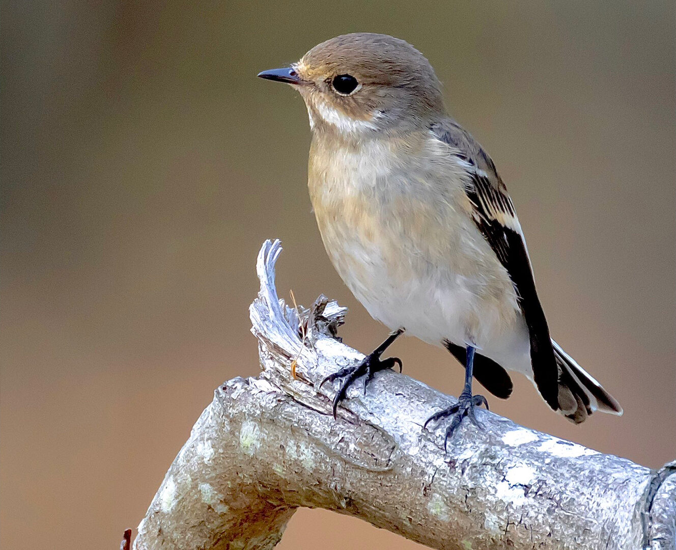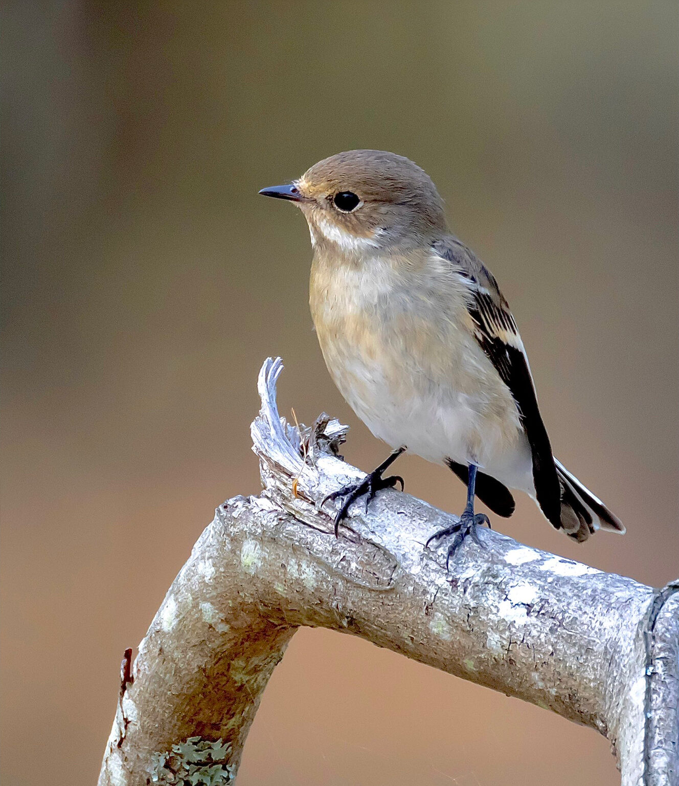 A small bird with brown and white plumage sits on a weathered, curving branch. Soft, diffuse light highlights the textured bark and creates gentle shadows around the bird’s form.