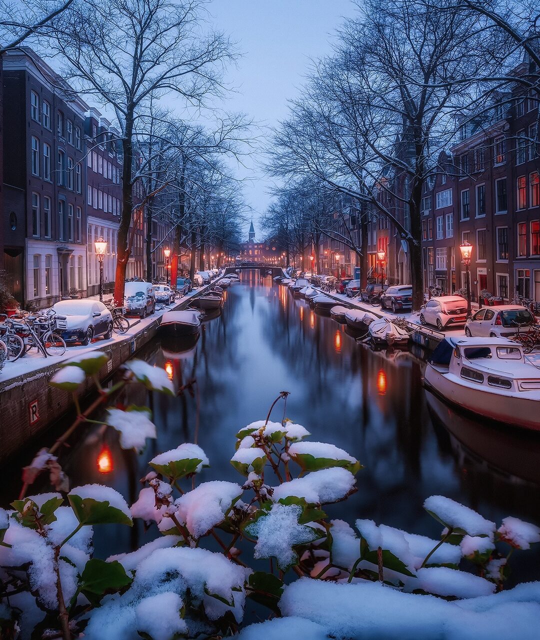 A city canal is lined with brick buildings and parked cars during twilight. Reflected lights create warm orange tones on the water’s surface, contrasted by the cool blue of the sky and patches of snow.