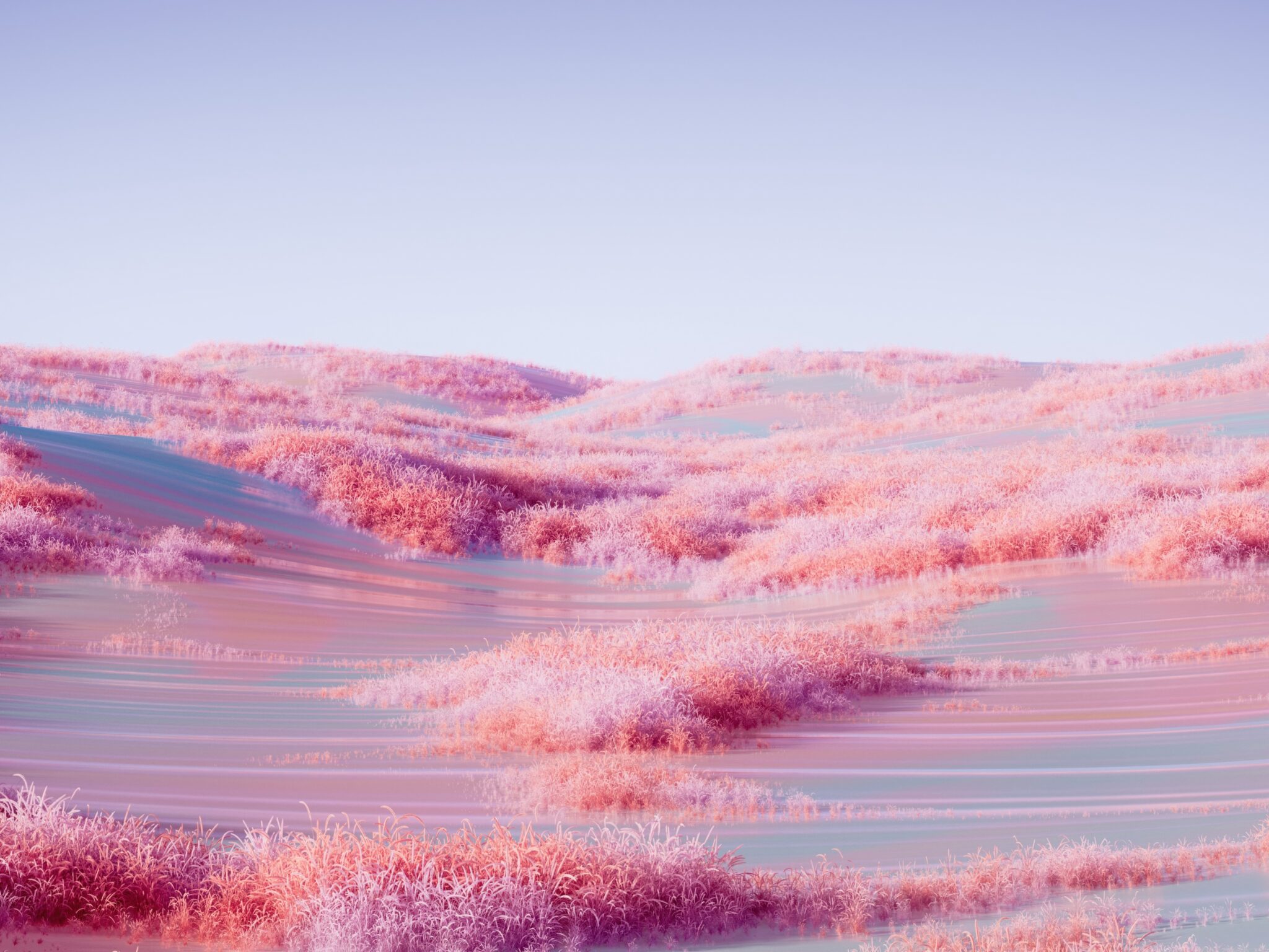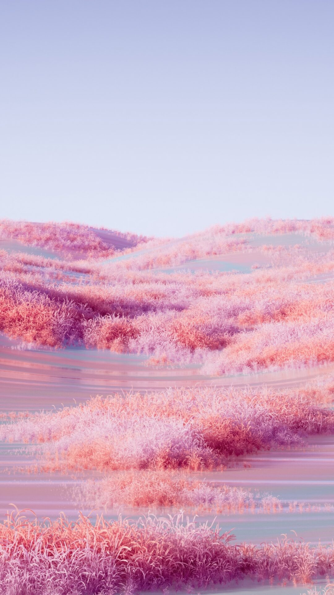 Rolling hills covered in soft coral and blush pink grass stretch across a dreamy landscape with pale blue water-like paths winding between them under a lavender sky. For 4K monitors.