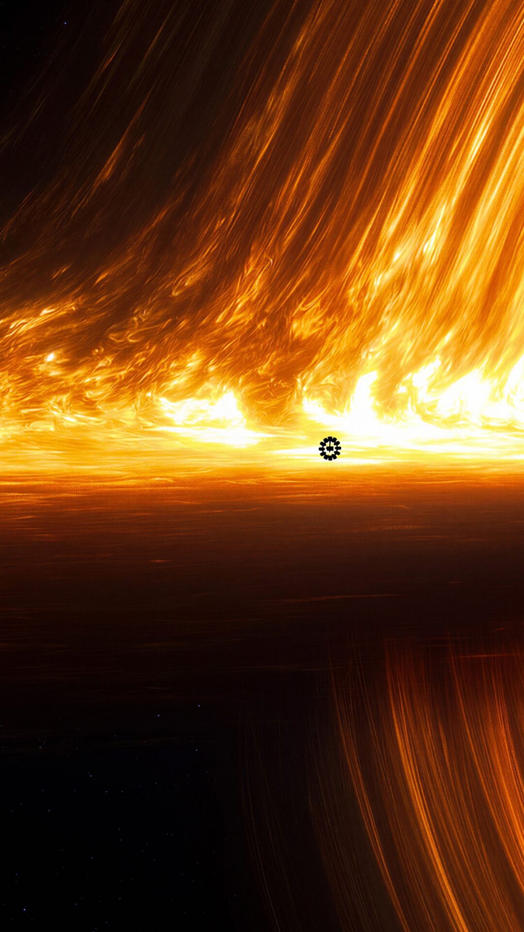 An orange and yellow solar flare extends across a dark background with a small dark planet visible within the intense light. The streaking f…