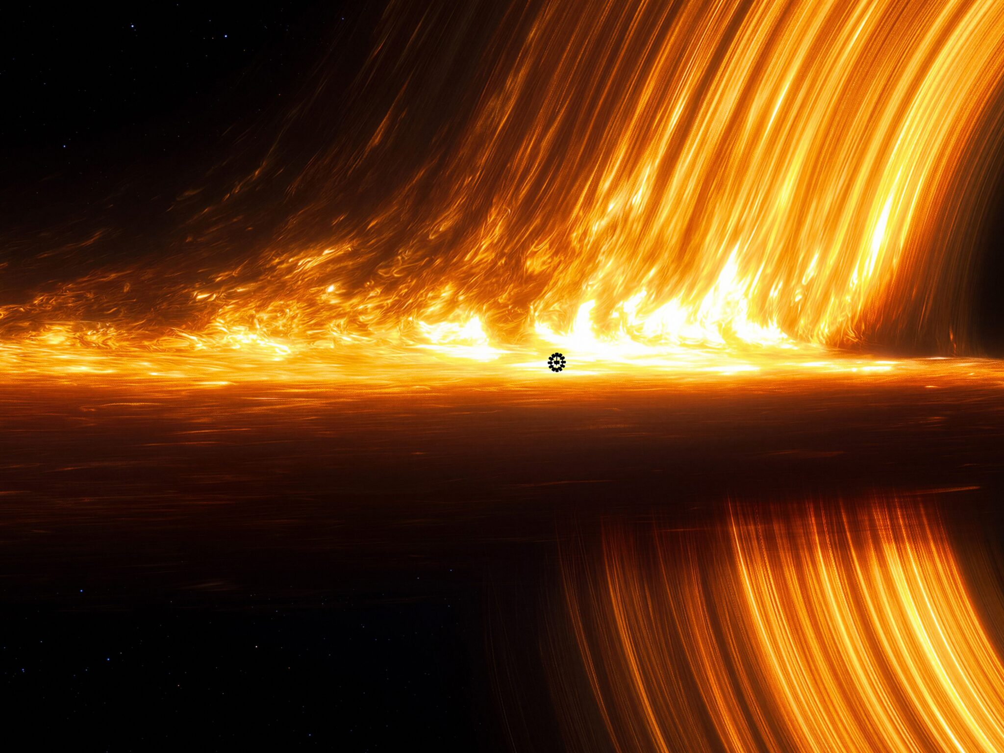 An orange and yellow solar flare extends across a dark background with a small dark planet visible within the intense light. The streaking flare and its reflection create a strong sense of depth and directional energy.